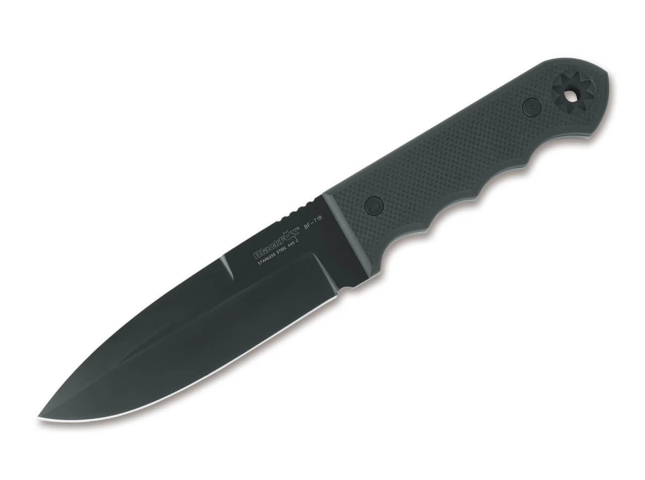 Ein klares und aufgeräumtes Bushcraft-Messer ohne Schnickschnack findet derjenige, der pure Funktion schätzt, im All Points von BlackFox. Die 15 cm lange und 6 Millimeter starke Spearpoint-Klinge aus 440C verfügt über eine lange Fehlschärfe am Rücken und ist damit universal einsetzbar. Die schwarze Beschichtung trägt zur sachlichen Gesamterscheinung des Messers bei. Die verschraubten und konturierten G10-Schalen mit ausgeprägten Fingermulden sorgen für sicheren Halt. Eine großdimensionierte Fangriemenöse am Griffende kann Paracord oder ein kräftiges Lederband aufnehmen. Eine sorgfältig angepasste Kydex-Scheide mit Gürteladapter machen ein leistungsfähiges Paket aus dem Outdoor-Werkzeug.