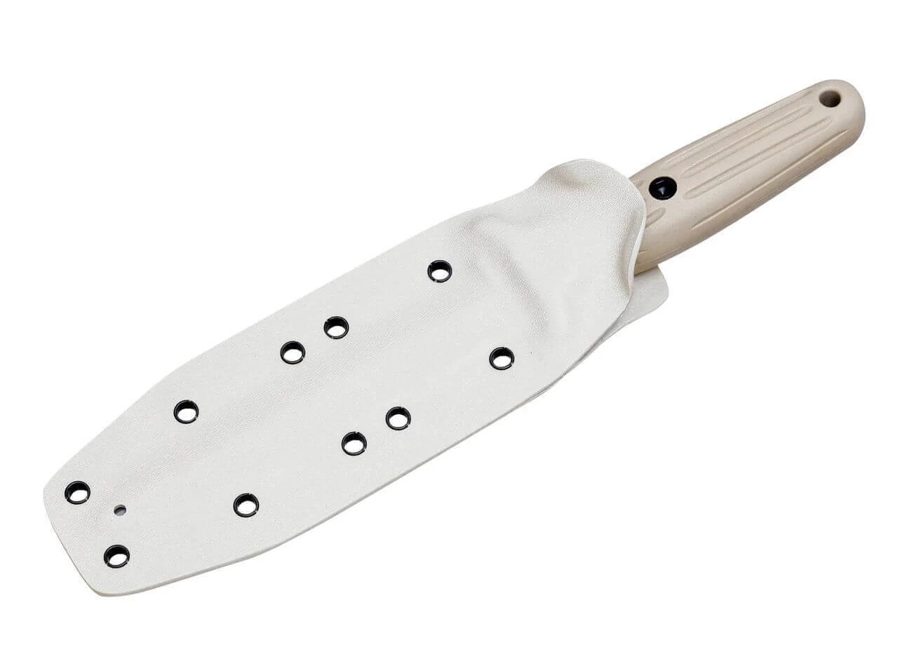 Der sandfarbene glasfaserverstärkter Kunststoff-Griff mit integrierten Edelstahlgewichten liegt sicher in der Hand, die matt gestrahlte 440C-Klingen und die Knebel und Schrauben mit PVD-Beschichtung ergänzen sich optisch hervorragend. Lieferung mit ebenfalls sandfarbener Kydex-Scheide und einem passenden Gürteladapter.