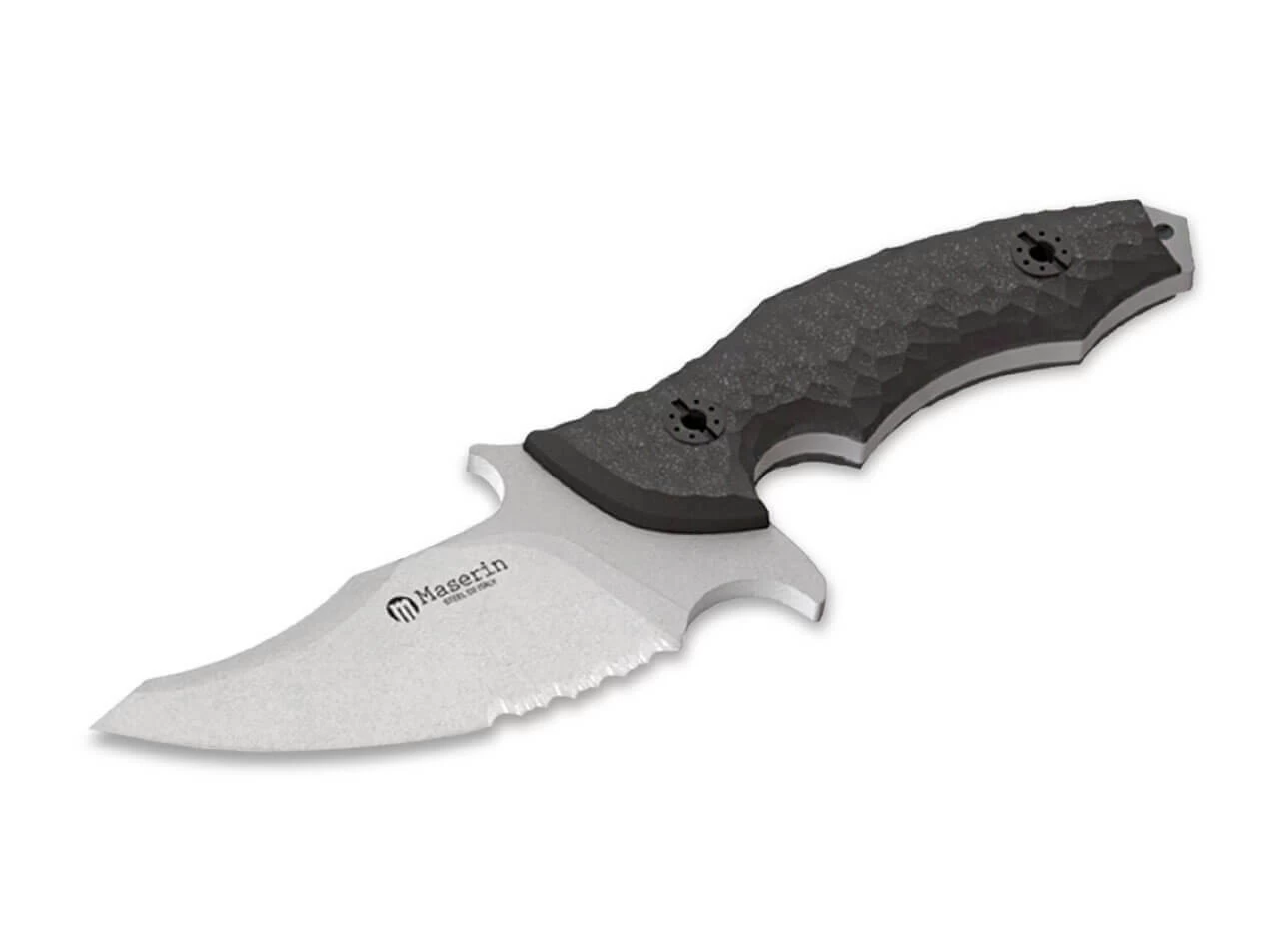 Das Maserin Badger G10 Black von Alessandro Zanin besticht durch sein aggressives Design und erklärt selbst widerspenstige Schneidarbeiten des Alltags zum Freiwild. Die kompromisslose Klinge aus D2 überzeugt in Schnitt und Form und kann nur durch die mitgelieferte Kydexscheide gebändigt werden. Der Griff aus schwarzem G10 ist texturiert und ergonomisch geformt, so dass das feststehende Messer stets sicher in der Hand liegt. Mit Glasbrecher an der Fangriemenöse.