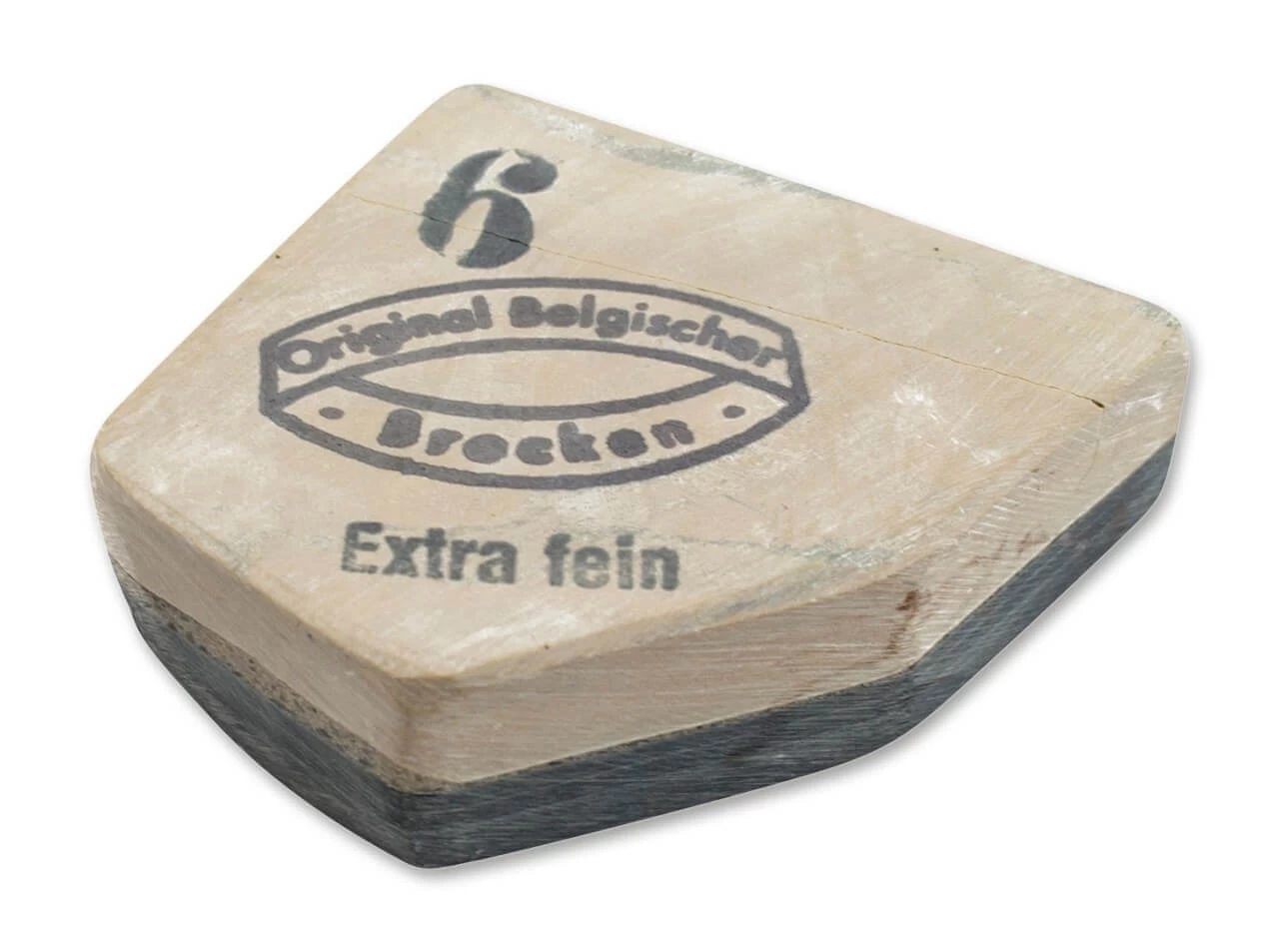 Belgische Brocken werden zum Nachschärfen von Messern verwendet. Es handelt sich hierbei um Natursteine, die in den Belgischen Ardennen abgebaut werden. Ihre einzigartige Zusammensetzung ermöglicht ein feines und materialschonendes Schleifen.Die helle Schicht wird zum Schleifen verwendet, die Schieferlage an der Unterseite dient lediglich zu Verstärkung des Schleifsteins.
