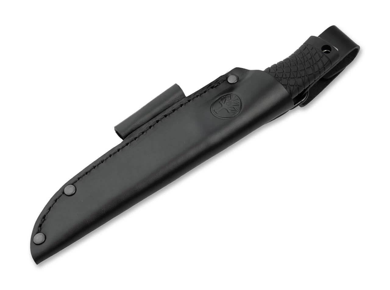 Zur Ausstattung gehört eine Köcherlederscheide – die Königsdisziplin im Scheidenbau – mit tiefem und festem Sitz des Messers. Das Messer ist beim Führen somit sowohl vor Verlust als auch vor Beschädigung bestmöglich geschützt, ohne eine beschädigungsanfällige Sicherung zu erfordern, die den schnellen Zugriff erschwert. Ein abnehmbarer Dangler ermöglicht wahlweise entweder eine hohe Trageposition am Gürtel oder eine Tiefe unter dem Hüftgurt des Tourenrucksacks. Somit wird das Böker BRONCO zum kompakten, vielseitigen und unverzichtbaren Wildnis- und Überlebenswerkzeug, das jeder Situation gewachsen ist. Handgefertigt in der Böker Manufaktur Solingen.