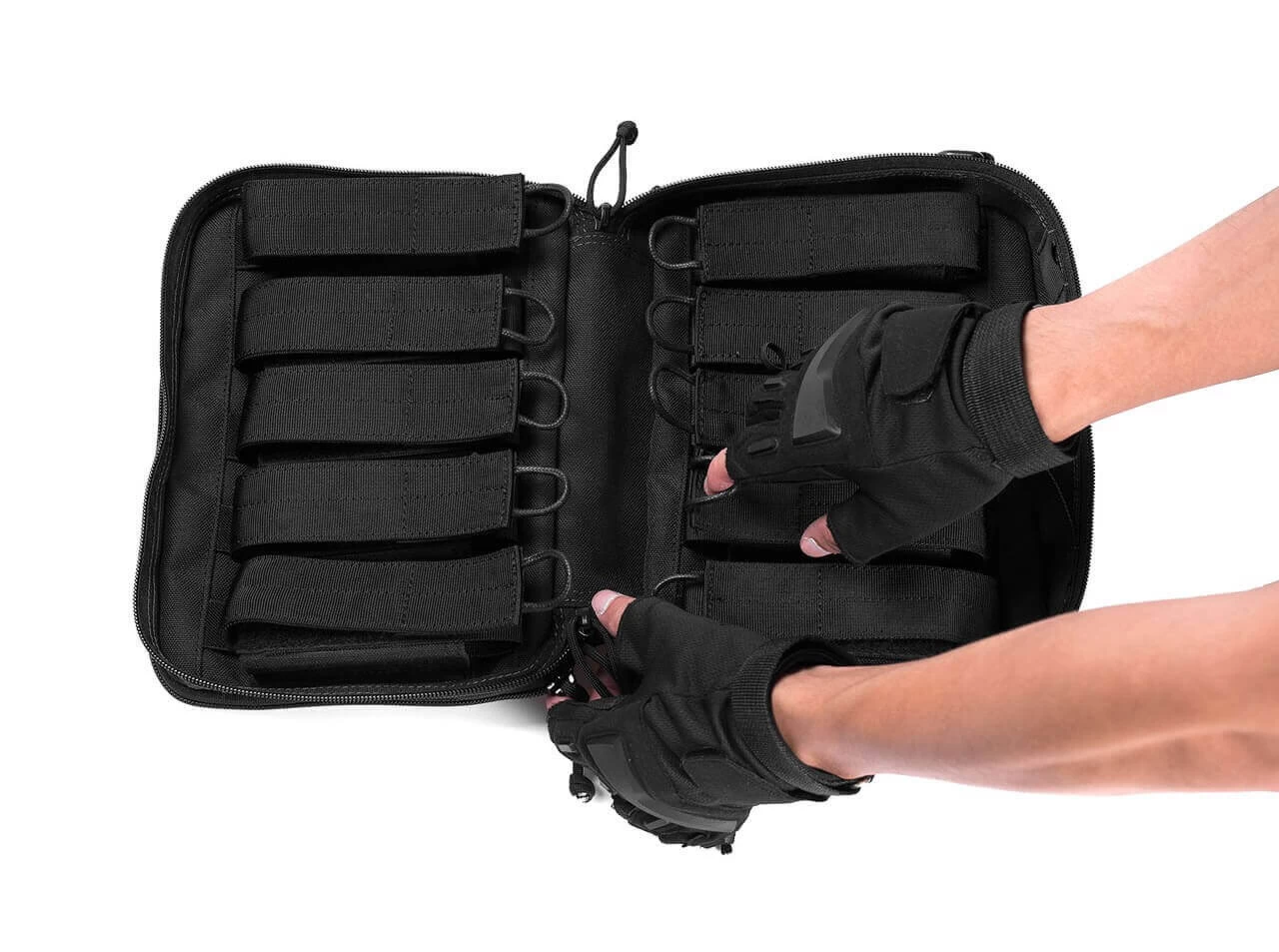 Die taktische Tasche aus robustem und wasserfestem Nylon bietet Platz für ein Laptop oder andere elektronische Kleingeräte. Der Clou sind die 10 außen anbringbaren Messertaschen (je 13 x 5 cm), die per Klettverschluss befestigt werden können. Darüber hinaus kann die komplette Tasche auch auf Links benutzt werden. Der Schulterriemen erlaubt ein flexibles und angenehmes Tragen der schwarzen Tasche. Abmessungen: 27 cm (L) x 21,5 cm (H) x 10 cm (T).