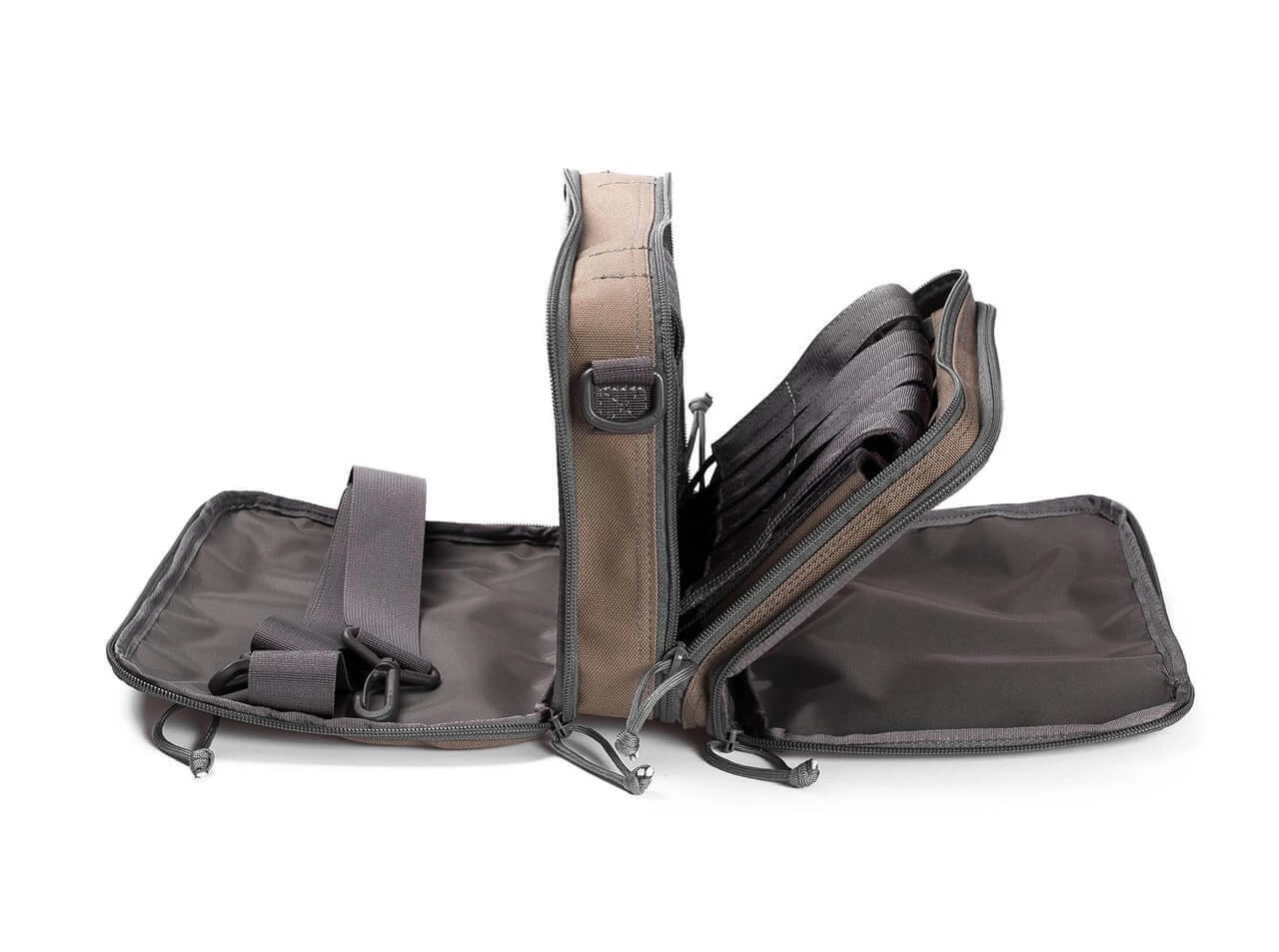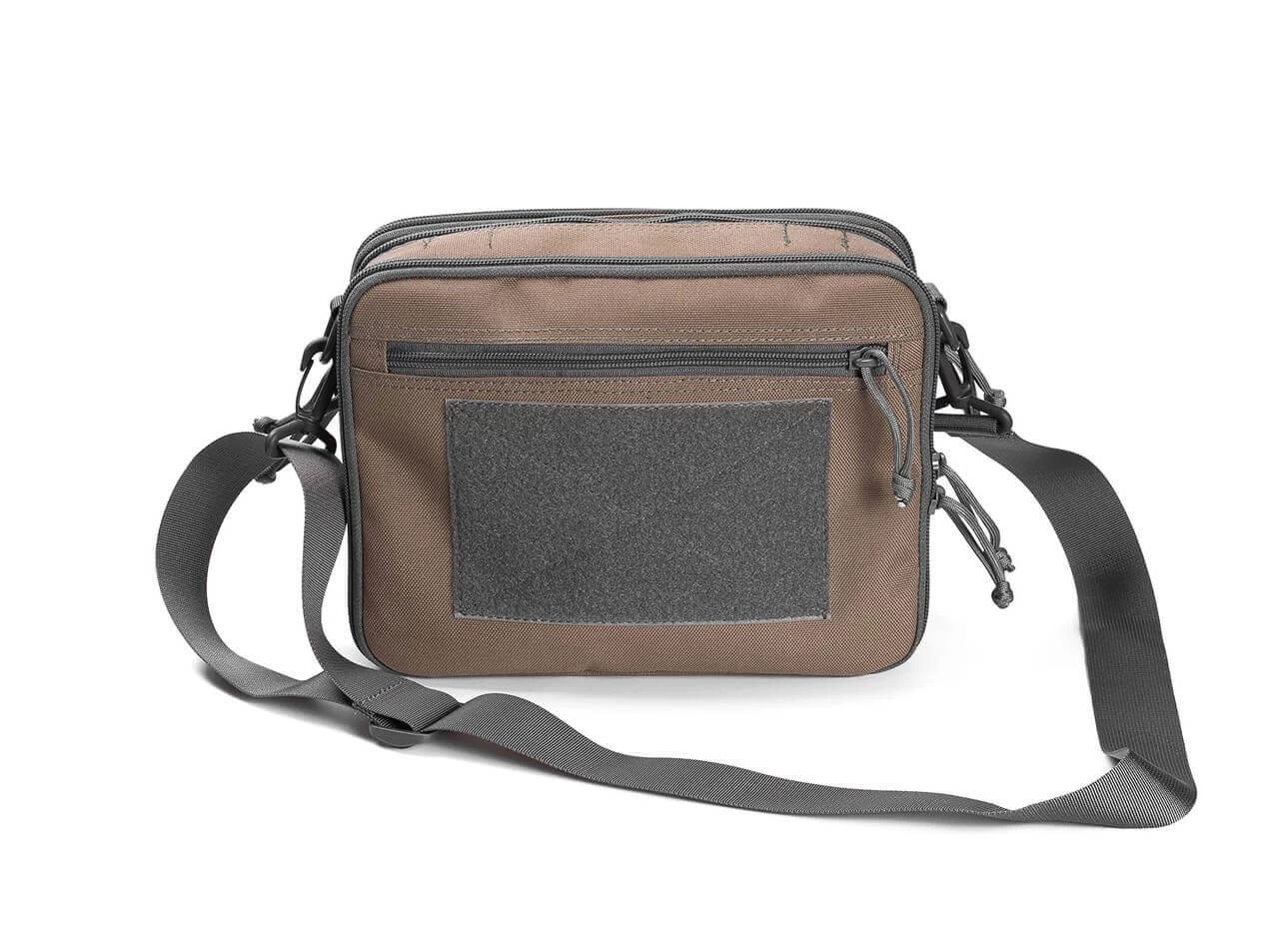 Die taktische Tasche aus robustem und wasserfestem Nylon bietet Platz für ein Laptop oder andere elektronische Kleingeräte. Der Clou sind die 10 außen anbringbaren Messertaschen (je 13 x 5 cm), die per Klettverschluss befestigt werden können. Darüber hinaus kann die komplette Tasche auch auf Links benutzt werden. Der Schulterriemen erlaubt ein flexibles und angenehmes Tragen der braunen Tasche. Abmessungen: 27 cm (L) x 21,5 cm (H) x 10 cm (T).