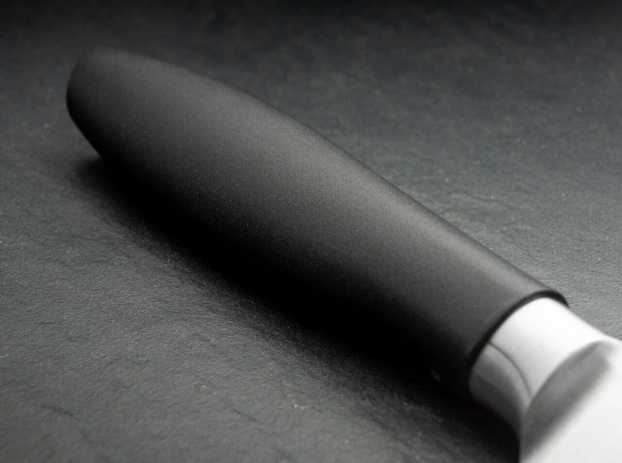 Der geschmiedete Kropf bietet jederzeit einen sicheren Griff und schützt bei einem Abrutschen vor möglichen Verletzungen. Als besonderes Design-Feature ist der Klingenrücken bei allen Messern dieser Serie sanft abgerundet. So liegt das Messer in jeder Griffposition angenehm in der Hand und verhindert auch bei stärkerem Druck auf den Klingenrücken im Wiegeschnitt ein unangenehmes Druckgefühl in der Hand.