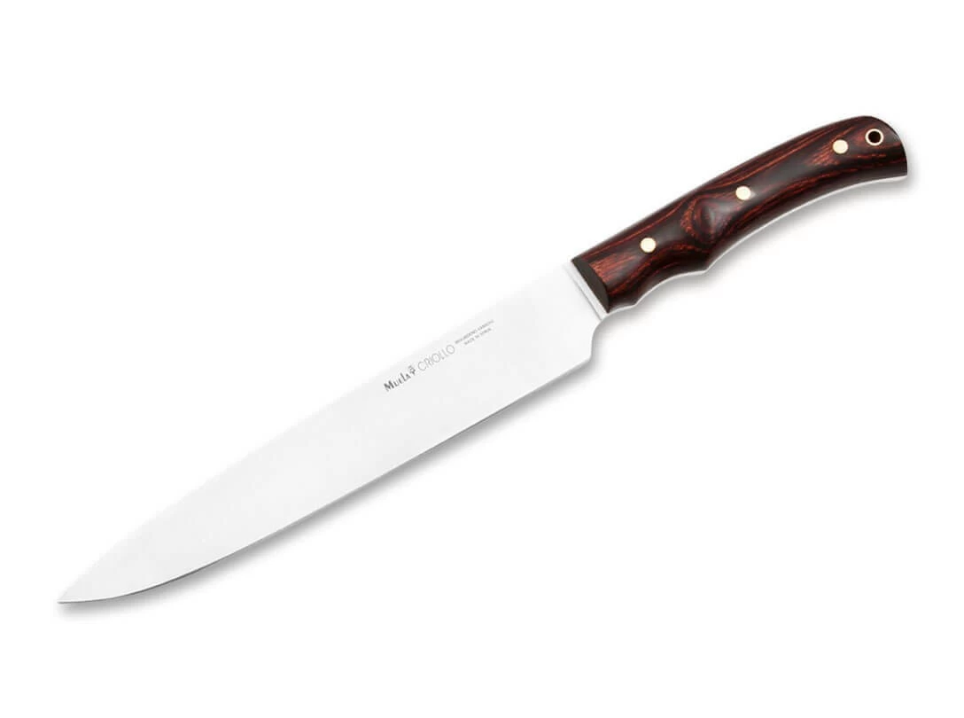 Das elegante Muela Criollo-20R ist dank seiner lange Klinge aus X50CrMoV15 prädestiniert für die Jagd und Bushcraft-Abenteuer in der Natur. Die einzigartige Maserung des Griffs aus Korallenholz rundet die ausdrucksstarke Erscheinung des Messers ab. Die Hohlniete am Griffende kann als Fangriemenöse genutzt werden. Lieferung mit edler Lederscheide.