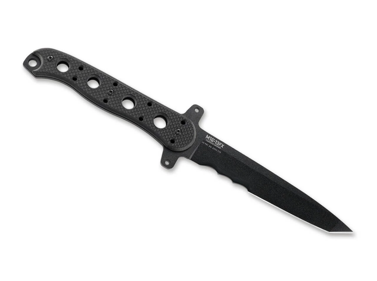 Die beliebte Taschenmesserserie M16 von CRKT wird mit dem M16-13FX um ein feststehendes Messer erweitert. Entworfen von dem verstorbenen Messermacher Kit Carson, behält es die ursprünglichen taktischen Merkmale der M16-Serie selbstverständlich bei. Die pulverbeschichtete Tanto-Klinge mit Teilwellenschliff wird aus SK-5 gefertigt, einem modernen Kohlenstoffstahl mit exzellenter Schnitthaltigkeit. Als feststehende Klinge ist sie auch für gröbere Arbeiten bestens geeignet. Das bewährte Griffdesign ist mit Schalen aus rutschfestem G10 versehen. Mit Fangriemenöse und vielseitiger Scheide aus GFK.