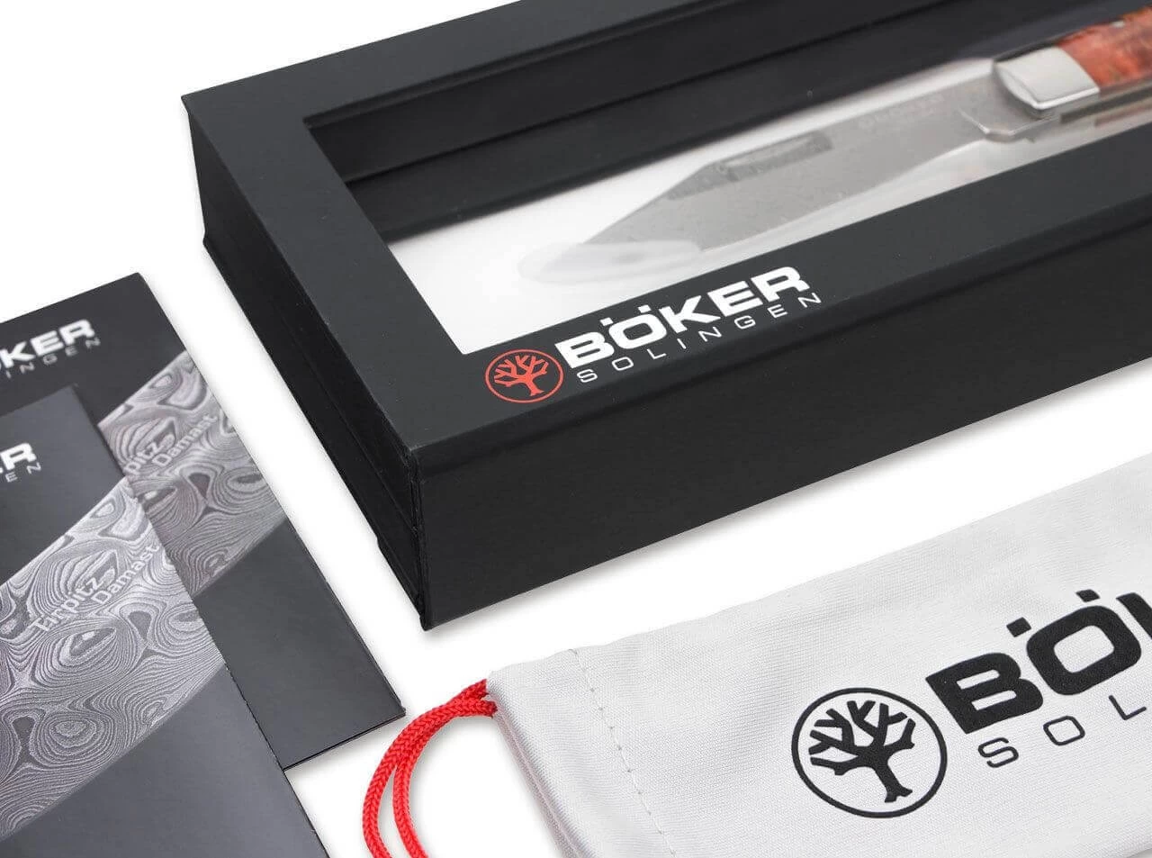 Die Platinen werden ganz klassisch aus Messing gefertigt, während die Backen aus Neusilber bestehen. Die Klinge aus handgeschmiedetem, rostfreiem Damascus von Chad Nichols aus Mississippi in den USA überzeugt mit 200 Lagen und dem Damascusmuster Scrambled. Sie verriegelt sicher per Backlock und harmoniert prächtig mit den fein gemaserten Holzschalen aus Maserbirke, die im edlen Farbton Amboina-Rot gebeizt sind. Mit dem neu aufgelegten historischen Boker Baumzeichen-Emblem. Von Hand gefertigt in der Boker Manufaktur in Solingen und weltweit streng auf 999 Exemplare limitiert. Auslieferung mit edlem Schwebedisplay, Echtheitszertifikat und individueller Seriennummer.