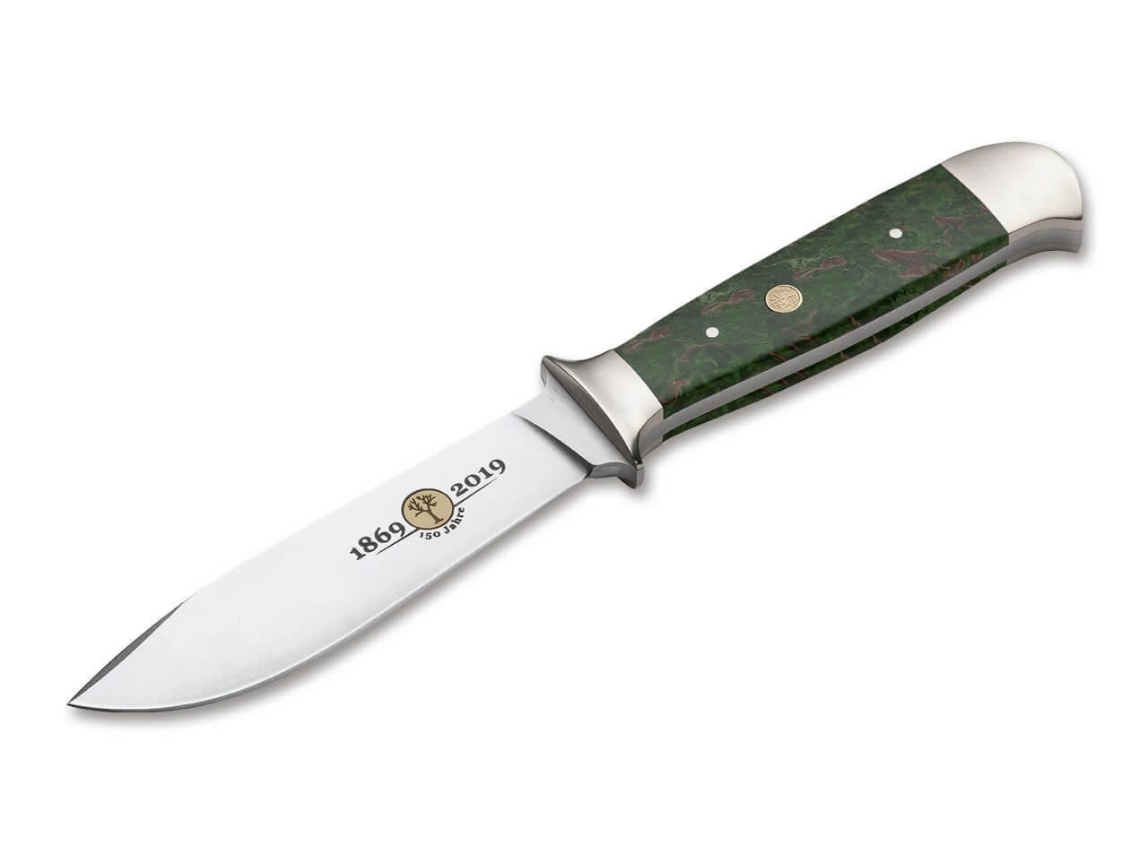 Der Böker Försternicker ist mit seiner breiten, leicht bauchigen Klinge aus N690 bestens für ein vielseitiges Einsatzspektrum geeignet. Der gerundete Klingenrücken mit der dezenten Daumenriffelung erhöht den Griffkomfort und betont die Exklusivität des Messers. Dank der Neusilberbacken und des Abschlussknaufs liegt der Försternicker ausgezeichnet in der Hand, und die ebenfalls klassisch gehaltene Nickerscheide ermöglicht ein problemloses Führen. Handgefertigt in Solingen und streng limitiert auf 150 Exemplare weltweit. Die Auslieferung erfolgt mit individueller Seriennummer, in einer speziellen Jubiläumsverpackung und mit Echtheitszertifikat.
