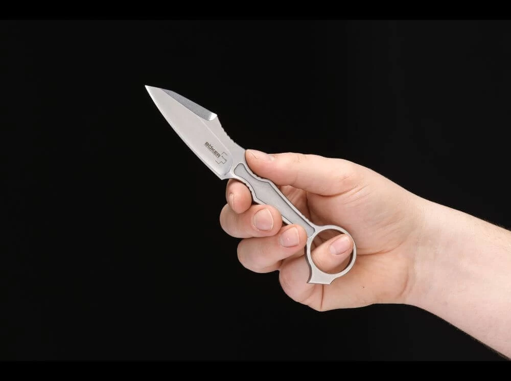 Das Böker Plus GITFO von DJ Urbanovsky ist ein sehr minimalistisches Messer, das mit seiner schlanken Ganzstahlkonstruktion sehr flach und kompakt baut und einen überragenden Tragekomfort bietet. Der Ring am Griffende gewährleistet unzählige Griff- und Handlingsoptionen und macht das GITFO zu einem ausgezeichneten Back-Up, das nicht nur am Gürtel getragen werden kann, sondern auch als großes Neck Knife durchgeht. Die Mulden und Riffelungen an Griff und Klinge sorgen im Zusammenspiel mit dem Ring für eine sehr gelungene Ergonomie. Gefertigt aus 440C, mit Stonewash-Finish. Lieferung mit schlanker Kydexscheide und Kugelkette.
