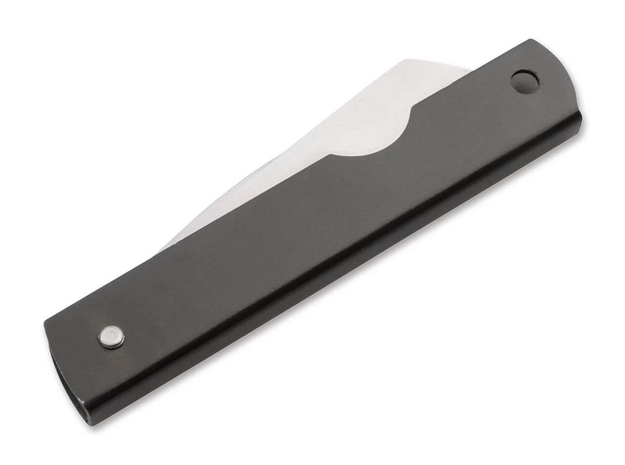 Vom Griffaufbau aus gebogenem Edelstahlblech identisch mit einem klassischen Higonokami, wartet dieses kleine unverwüstliche Messer mit drei Klingen aus rostfreiem 440er-Edelstahl auf. Die Hauptklinge hat die traditionelle japanische Formgebung mit Reverse-Tanto-Spitze. Hinzu kommen eine etwas kürzere Hawkbill-Klinge – ideal zum Kappen von Schnur und Öffnen von Säcken oder Kartons – sowie eine bissige geschränkte Säge, die auf Zug und Druck arbeitet. Damit wird dieses kleine Messer zu einem umfassend ausgestatteten Wildnis-Werkzeug, dessen Verhältnis von Preis und Größe zu Vielseitigkeit und Zuverlässigkeit seinesgleichen sucht. Der Griff ist nach historischem Vorbild im authentischen Farbton Oliv Drab lackiert und verfügt über ein Fangriemenöse zum Sichern dieses nützlichen kleinen Ausrüstungsgegenstandes.