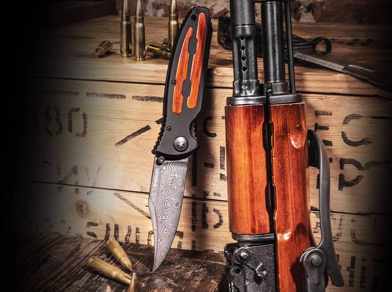 Mikhail Kalashnikov persönlich besuchte 2002 die Böker Manufaktur in Solingen und stellte die Messerlinie Böker Kalashnikov offiziell der Öffentlichkeit vor. Über 70 Jahre nach der Indienststellung des AK-47 präsentieren wir nun ein wirklich außergewöhnliches Sondermodell der Messerlinie und honorieren erneut seine geniale Ingenieursleistung. Das Böker Kalashnikov Bajonett Damast ist mit einer einzigartigen Damastklinge ausgestattet, die aus dem Stahl der Bajonette 6Ch3 und 6Ch4 nach dem GRAU-Index der ehemaligen Sowjetarmee gefertigt wird und mit der Unterschrift von General Kalashnikov verziert ist. Der rostfreie Damast von Chad Nichols besteht aus 80 Lagen und wird von Hand im Muster Virus geschmiedet. Er weist eine ungewöhnlich filigrane Zeichnung auf, die das Ergebnis eines sehr kontrollierten Schmiedevorganges ist. Die Klinge mit der von den Bajonetten übernommenen Pandurenspitze wird mithilfe des Daumenpins geöffnet und von einem stabilen Linerlock verriegelt.