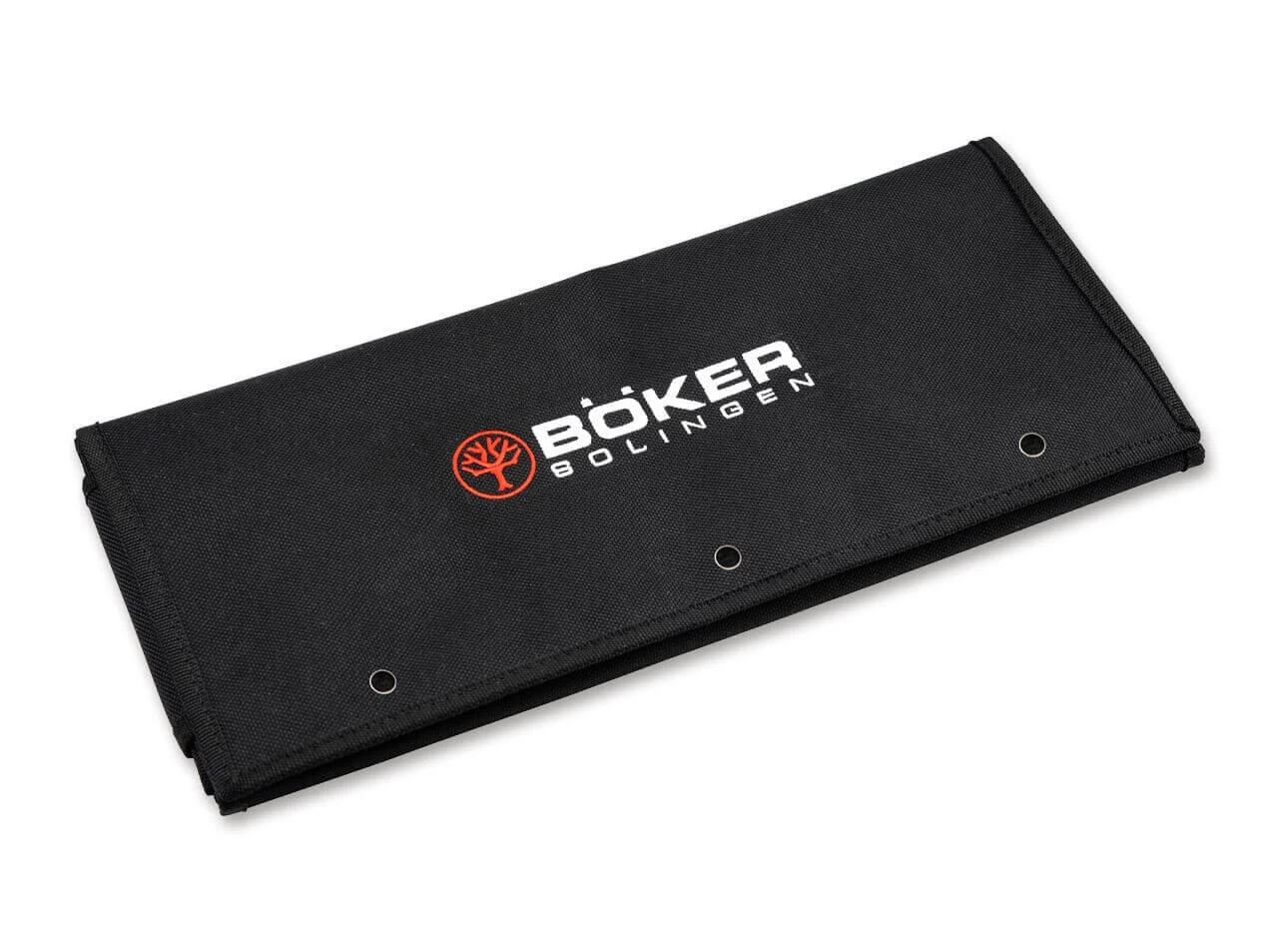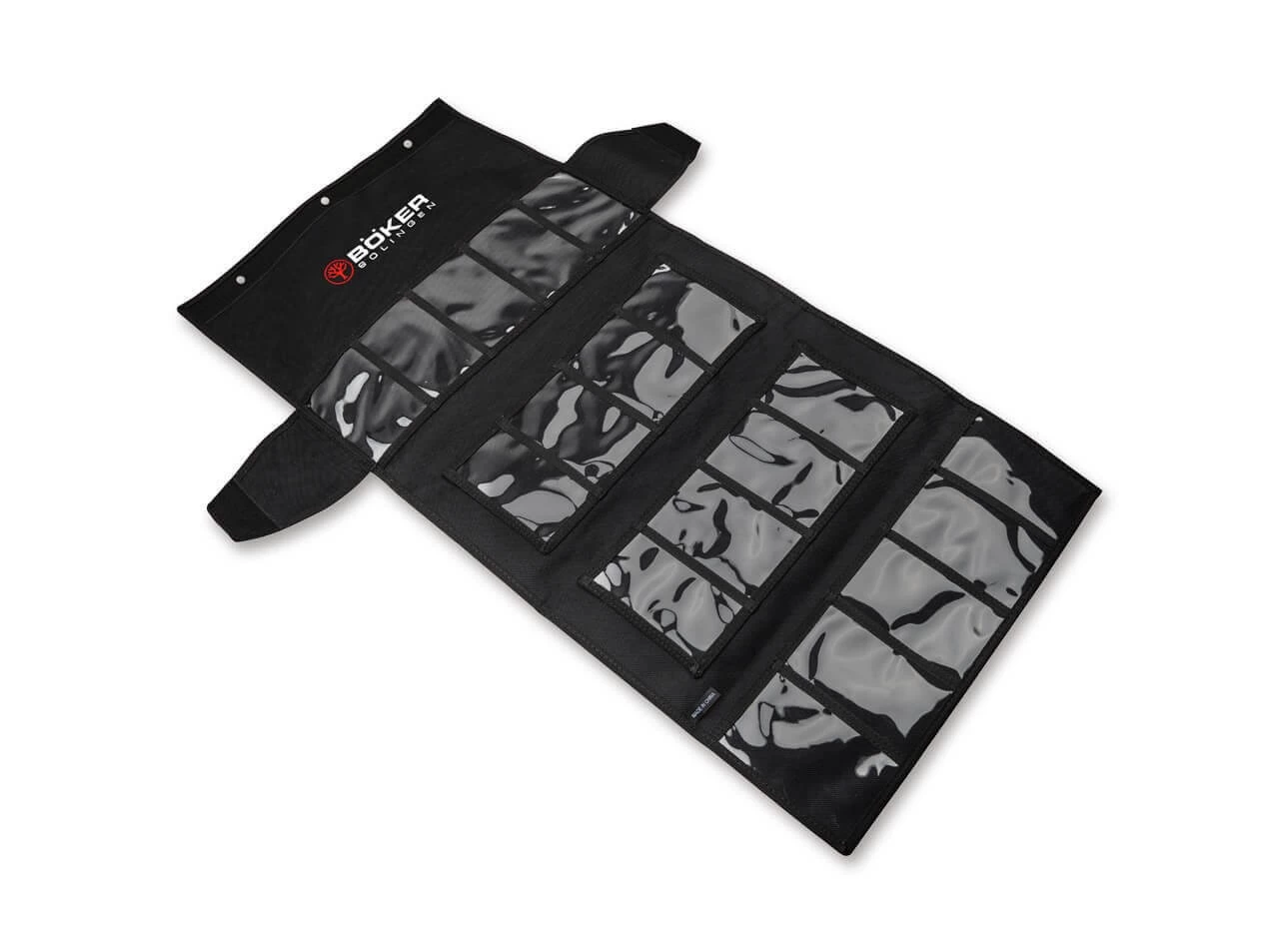 Ordnung ist das halbe Leben – die andere Hälfte übernimmt die praktische Böker Knife Vault mit Fenstern. Um die wertvolle Taschen-messersammlung für Aufbewahrung oder Transport sicher vor Kratzern, Scheuerstellen und Schmutz zu schützen, bietet die Messertasche 18 voneinander getrennte Fächer mit Sichtfenster. Die äußeren Fächer sind extra breit gehalten, um auch größere Folder problemlos unterbringen zu können. Die große Klettverschlusslasche ist mit drei Hohlnieten versehen, so dass die Messerfalttasche an der Wand aufgehangen werden kann, um bis zu 18 Taschenmesser repräsentativ in Szene zu setzen. Ein per Klett abnehmbarer Halter auf der Rückseite bietet Platz für Visitenkarte oder Merkzettel, während die Klettfläche alternativ für Patches benutzt werden kann. Das aufwendig gestickte Böker Logo rundet das diskrete Erscheinungsbild der schwarzen Messertasche formschön ab. Alles im Blick und alles en chic – ein Muss für jeden Messersammler. Außenmaße: Breite 40 cm x Höhe 18 cm.