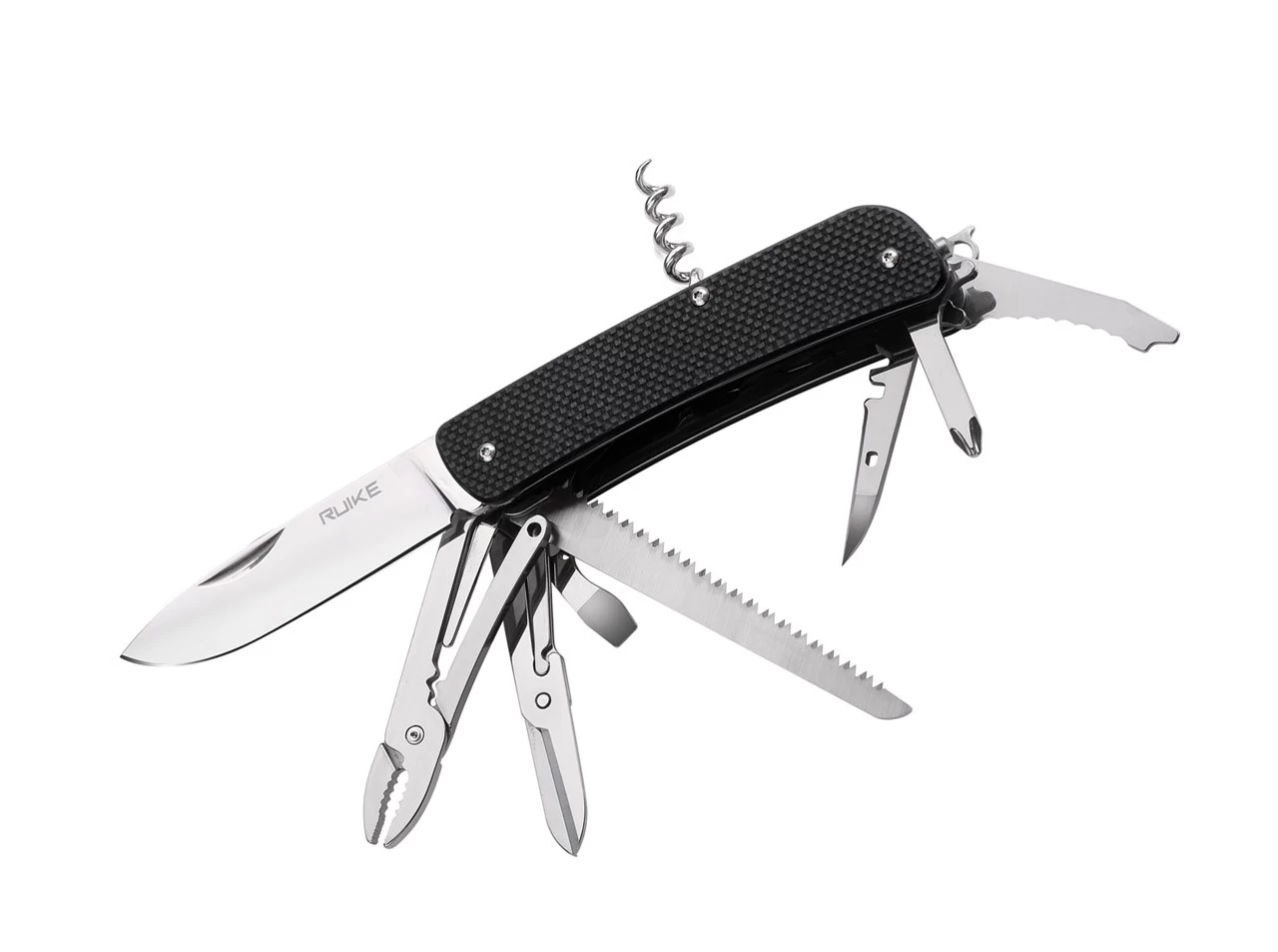 Mit großer Klinge und robusten Werkzeugen ist die Ruike L-Serie für alle Arten von Outdoor-Aktivitäten und den Notfallgebrauch geeignet. Die 8,5 cm lange polierte Klinge aus Sandvik 12C27 Edelstahl weist eine erweiterte Stärke und Breite auf und erreicht so eine längere Lebensdauer und vielseitigere Einsatzmöglichkeiten. Der Griff aus schwarzem strukturiertem G10 liegt sicher und angenehm in der Hand und ist ideal für eine jahrelange Benutzung. Zusätzlich verfügt es über einen Korkenzieher, Dosenöffner, Schraubendreher, Schaber, Flaschenöffner, Drahtabisolierer, Drahtschneider, kleinen Schraubendreher, Kreuzkopf-Schraubendreher, Drahtbieger, Schneidhaken, einer Pinzette, Säge, Schere, Zange und Ahle. Der Glasbrecher aus Wolframstahl ermöglicht dem Nutzer Glas oder andere robuste Materialien zu zerbrechen. Geöffnet wird das Messer per Nagelhau und gehalten wird es mit Hilfe eines Slipjoints. Mit Öse, Schlüsselring und Tip-down Clip.