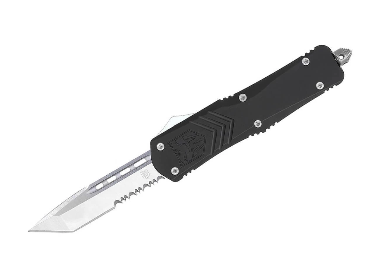 Die ausgewachsene Variante des beliebten FS-X überzeugt mit einer soliden D2 Tanto Klinge im Teilwellenschliff, die pfeilschnell per Knopfdruck aus dem vorderen Griffstück kommt und bei erneutem Betätigen wieder dort verschwindet. Das OTF Messer (Out The Front) ist mit einem schwarzen Griff aus hochfestem Aluminium versehen, der in einem eleganten Schwarz gehalten ist. Der Deep-Carry Clip ist am Glasbrecher befestigt und erlaubt eine beidseitige Tip-Up Trageweise. Lieferung mit hochwertigem Nylon Etui.