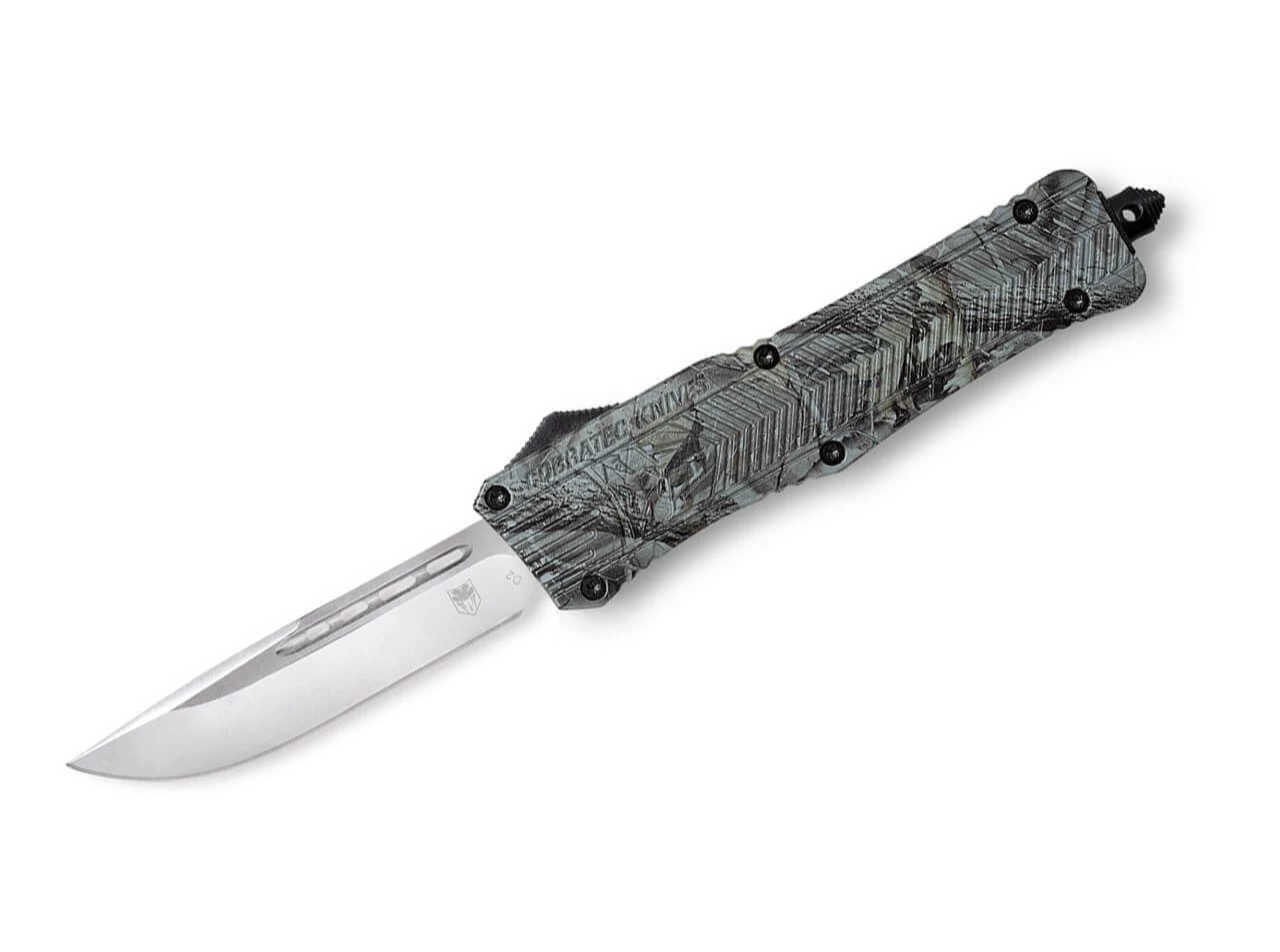 Die ausgewachsene Variante des beliebten CTK-1 überzeugt mit einer soliden D2 Drop Point Klinge, die pfeilschnell per Knopfdruck aus dem vorderen Griffstück kommt und bei erneutem Betätigen wieder dort verschwindet. Das OTF Messer (Out The Front) ist mit einem texturierten Griff aus hochfestem Aluminium versehen, der in einem waldgrünen Tarnmuster gehalten ist. Der Deep-Carry Clip ist am Glasbrecher befestigt und erlaubt eine beidseitige Tip-Up Trageweise. Lieferung mit hochwertigem Nylon Etui.
