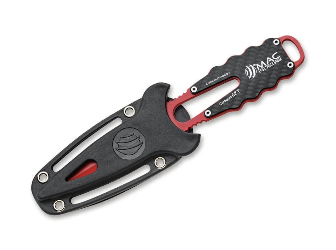 Das MAC Apnea Carbon erweitert die beliebten Tauchermesser des italienischen Herstellers aus Maniago. Die feurig rote Ganzstahlkonstruktion ist mit Griffschalen auf Kohlefaser versehen und ist am Klingenrücken mit einem Wellenschliff versehen. Die praktische Kunststoffscheide mit Beingurten kann beidseitig getragen werden.