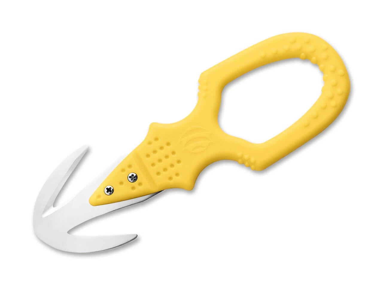 Der handliche gelbe Gurtschneider von MAC durchtrennt Gurte und Seile in wenigen Augenblicken.