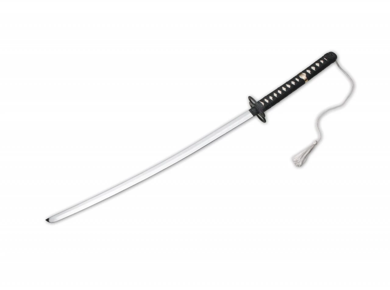 Traditionelles Samuraischwert mit einer Klinge aus rostfreiem 440er Stahl, die fein poliert ist und einen angedeuteten Hamon (Härtelinie) besitzt. Die Tsuba besteht aus schwarzem Gusseisen mit zwei großen Durchbrüchen. Der Griff zeigt die klassische Griffwicklung mit einer rochenhautähnlichen Unterlage und verfügt über eine Unterteilung aus Messing, die ihm eine sehr eigenständige Optik verleiht. Die Scheide aus Holz wird mit einem braunem Lack überzogen und einem Abschluss aus antikfarbenem Messing versehen.