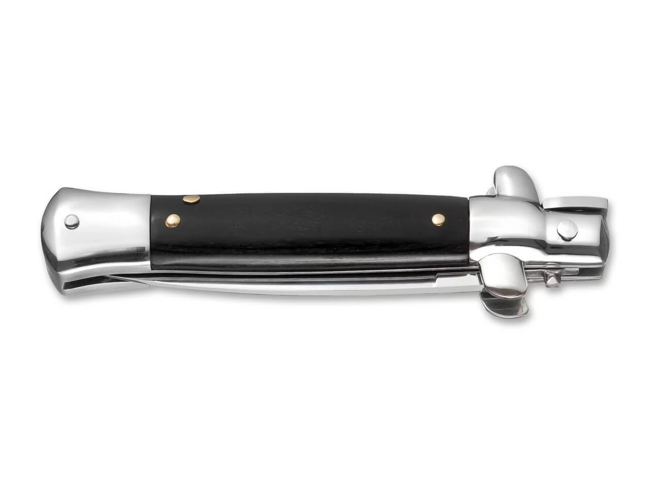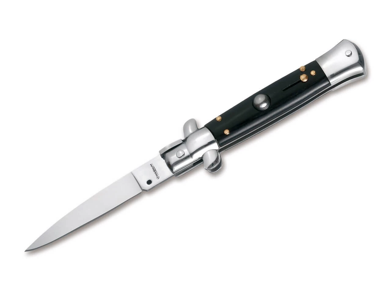 Das Magnum Sicilian Needle ist ein klassisches Springmesser nach historischem Vorbild. Das Stilett ist seit Dekaden das bekannteste italienische Taschenmesser und wurde bereits ab 1910 in der Region um Maniago gefertigt. Durch Betätigen des Druckknopfes wird die 440A-Klinge mit dem satten, weltbekannten Klack automatisch geöffnet. Schließen lässt sich das Magnum Sicilian Needle durch die seitlich angebrachten Parierelemente. Die Griffschalen werden aus dunklem Schichtholz gefertigt.