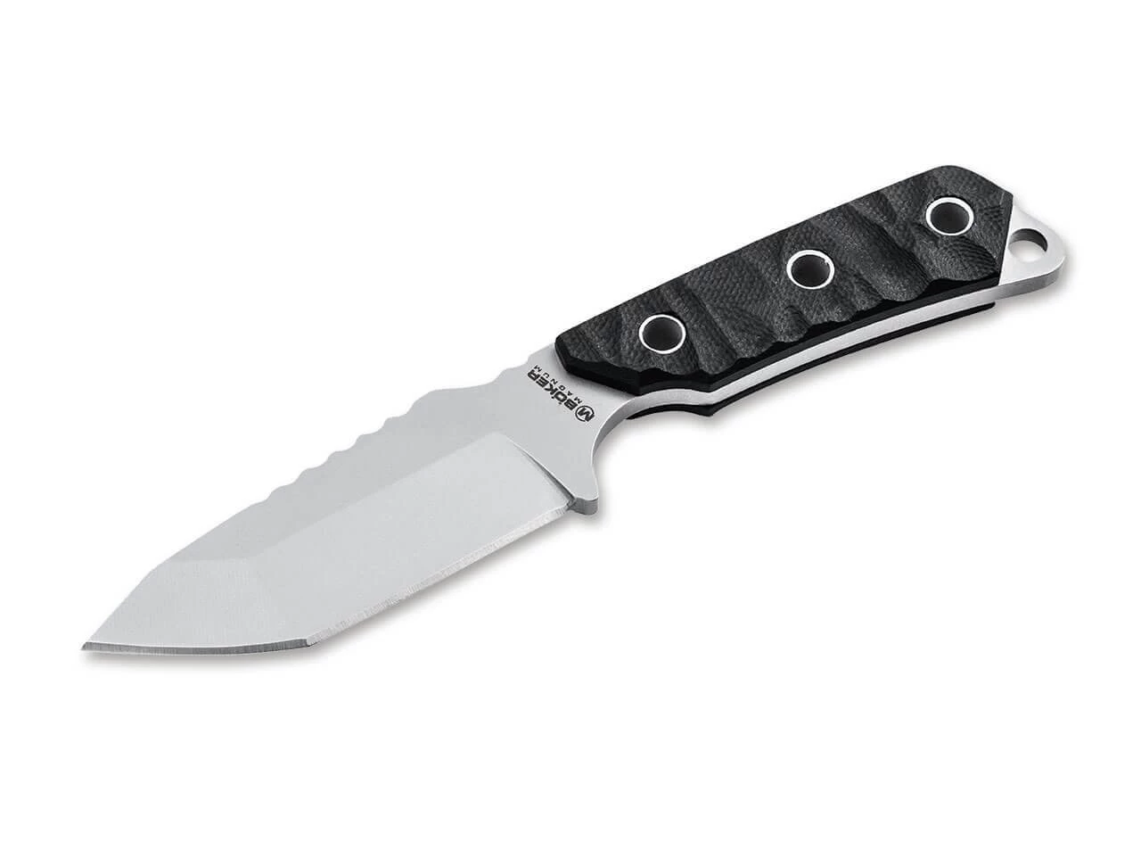Der verlässliche Rückhalt, wenn es darauf ankommt! – Das Magnum Survical Neckup ist das ideale Backup Messer im Neck Knife Format für abenteuerlustige Bushcrafter und Camper. Durch die wuchtige Vollerlbauweise eignet sich das feststehende Messer ideal zum Schneiden von Holz und grobem Astwerk. Volle Kontrolle versprechen die Jimpings auf dem Rücken der flachgeschliffenen Tanto-Klinge aus 440A sowie die griffigen G10 Schalen, die auch unter nassen Bedingungen besten Halt versprechen. Die drei Hohlnieten im Griff überzeugen in optischer wie auch in gewichtsoptimierter Hinsicht und werden durch die Fangriemenöse am Griffende abgerundet. Lieferung mit passgenauer Kunststoffscheide, die mit Feuerstahl und Kompass ausgestattet ist. Und wer sagt eigentlich, dass das Magnum Survival Neckup nur ein Zweitmesser ist?