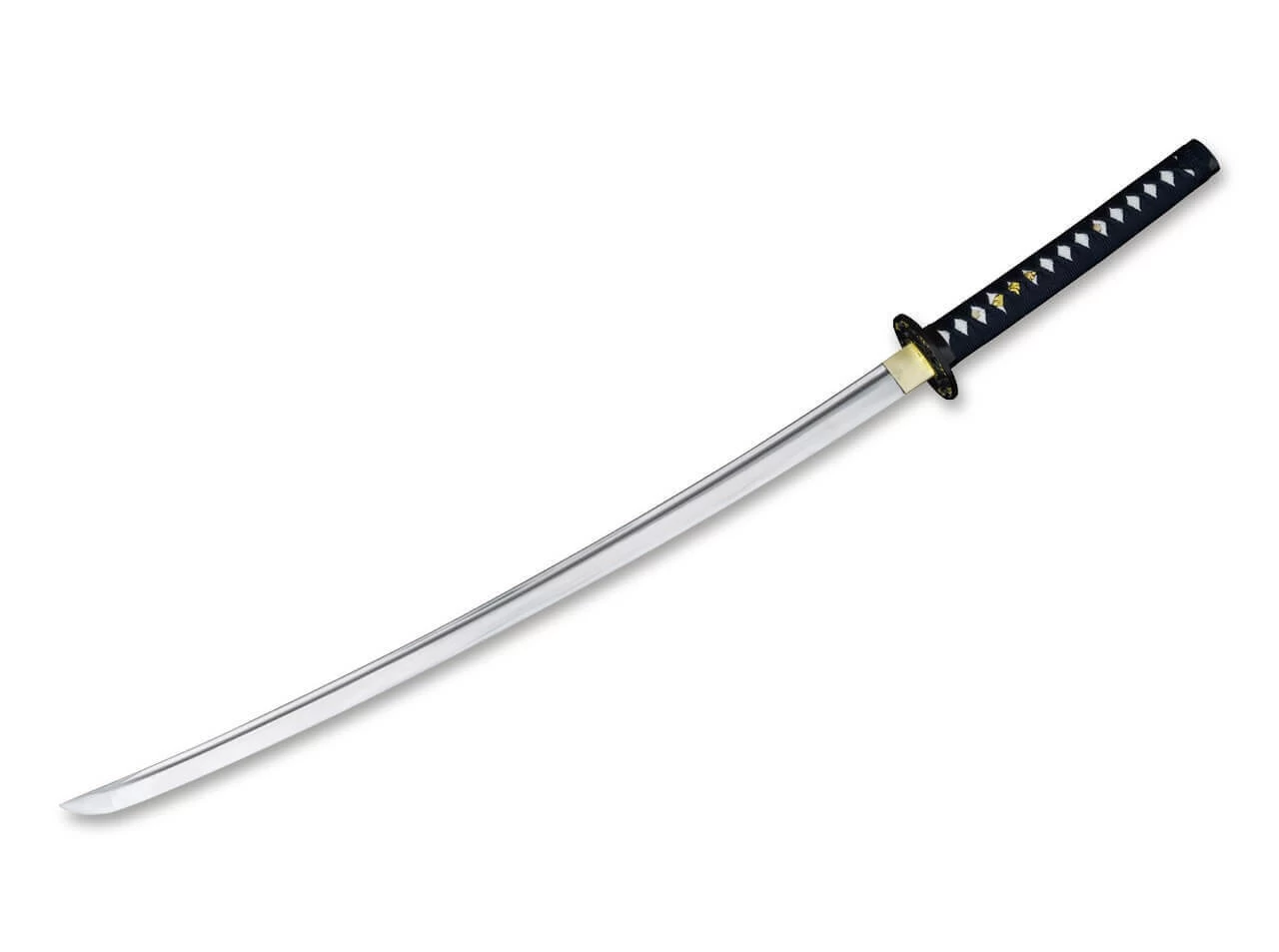 Reinheit, Fleiß und Demut zählten zu den Grundeigenschaften der altehrwürdigen Samurai. Als Hommage an die ruhmreichen Krieger des feudalen Japans präsentiert Böker das Magnum Yoshida Katana Dark Blue. Viele liebevolle Details zieren das Dekoschwert und bringen den Geist der Samurai näher. Die Klinge aus nicht rostfreiem Kohlenstoffstahl ist mit einer traditionellen Bo-Hi (Hohlkehle) versehen, während der Holzgriff die klassischen Elemente Tsuba (Stichblatt), Menuki (dekorative Elemente unterhalb der Griffwicklung) sowie ein dunkelblaues Tsuka-Ito (Griffband) aufweist. Goldfarbene Ornamente säumen die Saya (Schwertscheide), die mit einer typischen Sageo-Kordel zur Befestigung am Gürtel versehen ist. Deko- bzw. Sammlerschwert, nicht zum Einsatz geeignet!