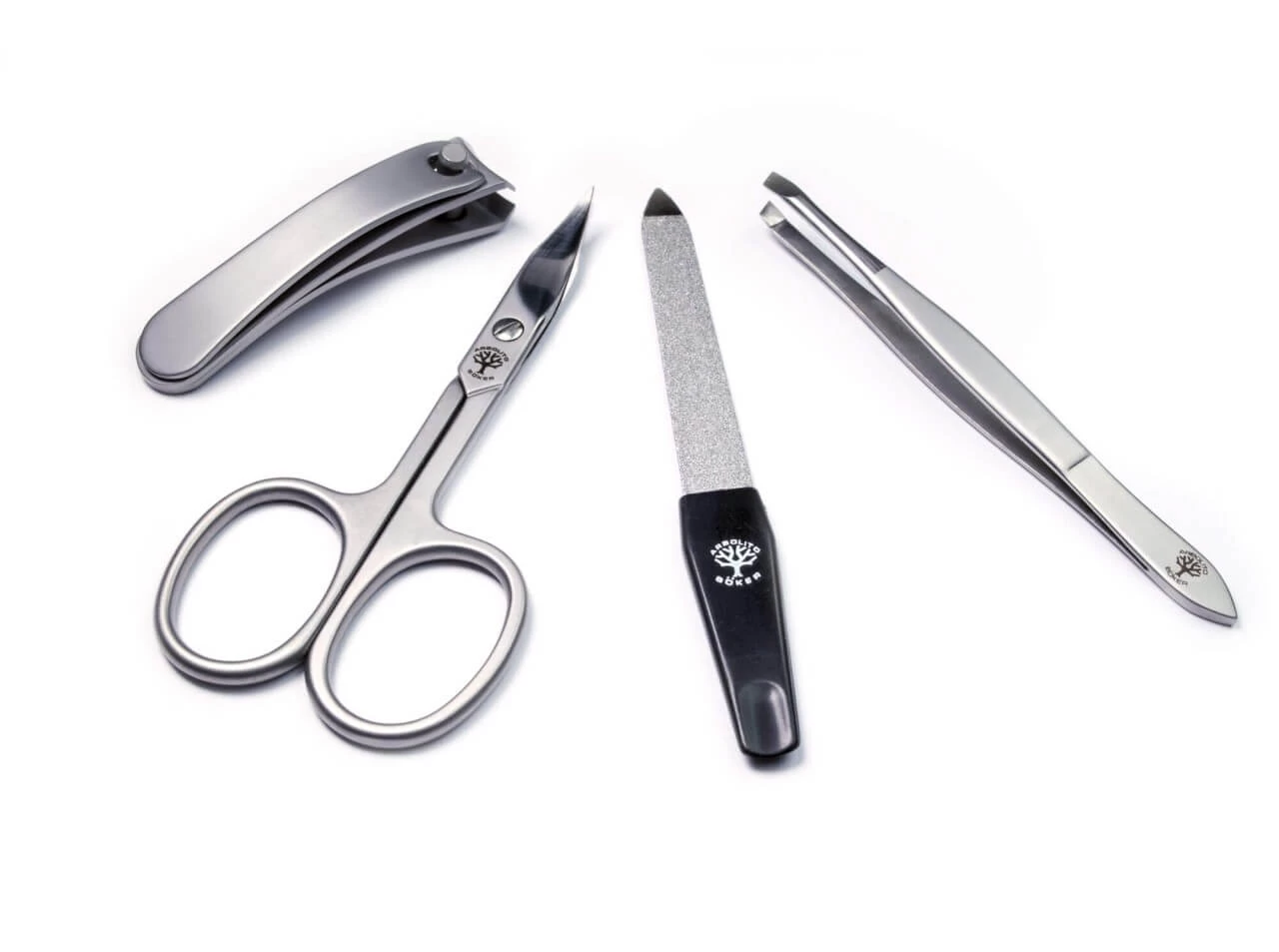 Vierteiliges Set mit Nagelschere, Nagelknipser, Pinzette und Nagelfeile.