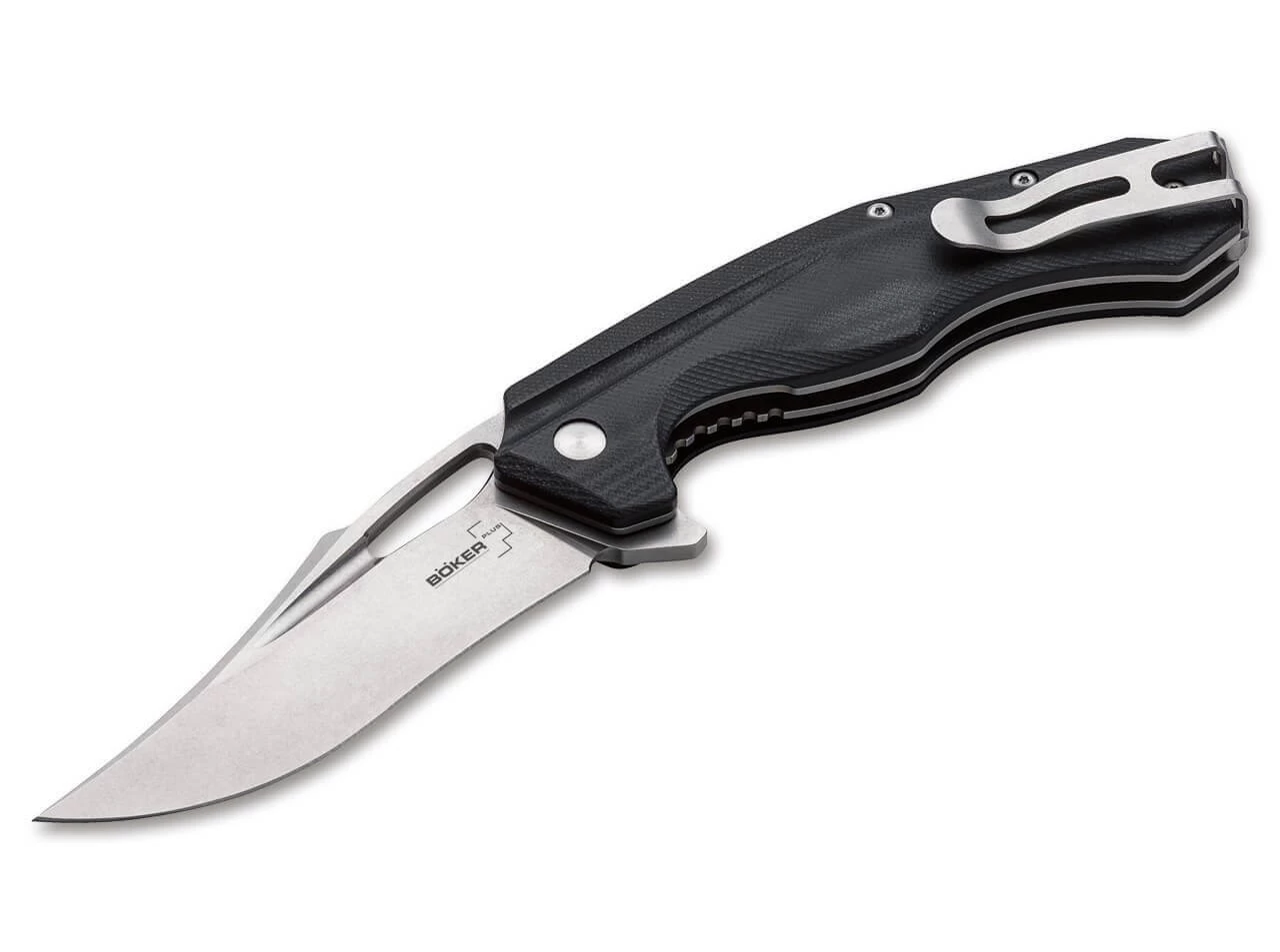 Mit Boris Manasherov haben wir einen Designer im Team, dessen Entwürfe unbedingte Praxistauglichkeit auf gekonnte Weise mit einem absolut eigenen und immer sehr charakteristischen Erscheinungsbild verbinden. Das Böker Plus Masada stellt hier keine Ausnahme dar, denn die fließenden Linien und die Ausformung des Griffes verbinden eine perfekte Ergonomie mit einer äußerst dynamischen Anmutung. Die leicht harpunenförmige Klinge aus D2 ist kugelgelagert und öffnet per Flipper. Konturierte G10-Schalen und solide Stahlplatinen ergeben zusammen mit dem Distanzstück, das ein Schlagstück und die Fangriemenöse integriert, einen extrem satt und sicher in der Hand liegenden Griff. Der Recurve-Schliff maximiert die Effektivität vor allem bei Zugschnitten. Klinge mit Stonewash-Finish. Mit Clip (Tip-up).