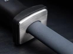 Die Lösung: Federnd gelagerte Hartmetallstäbe mit kohlefaserverstärkten Polyamiden, die an jeder Klinge fest anliegen. Zwei unterschiedliche Winkel zwischen Klinge und Schärfstäben, ergeben zwei Schleifstufen: 1. Schärfen des Messers mit deutlichem Materialabtrag (Messerspitze nach unten beim Durchziehen) und 2. Abziehen (feines Entgraten) der Messerschneide (Spitze nach oben beim Durchziehen). Das Ergebnis ist einfach perfekt.