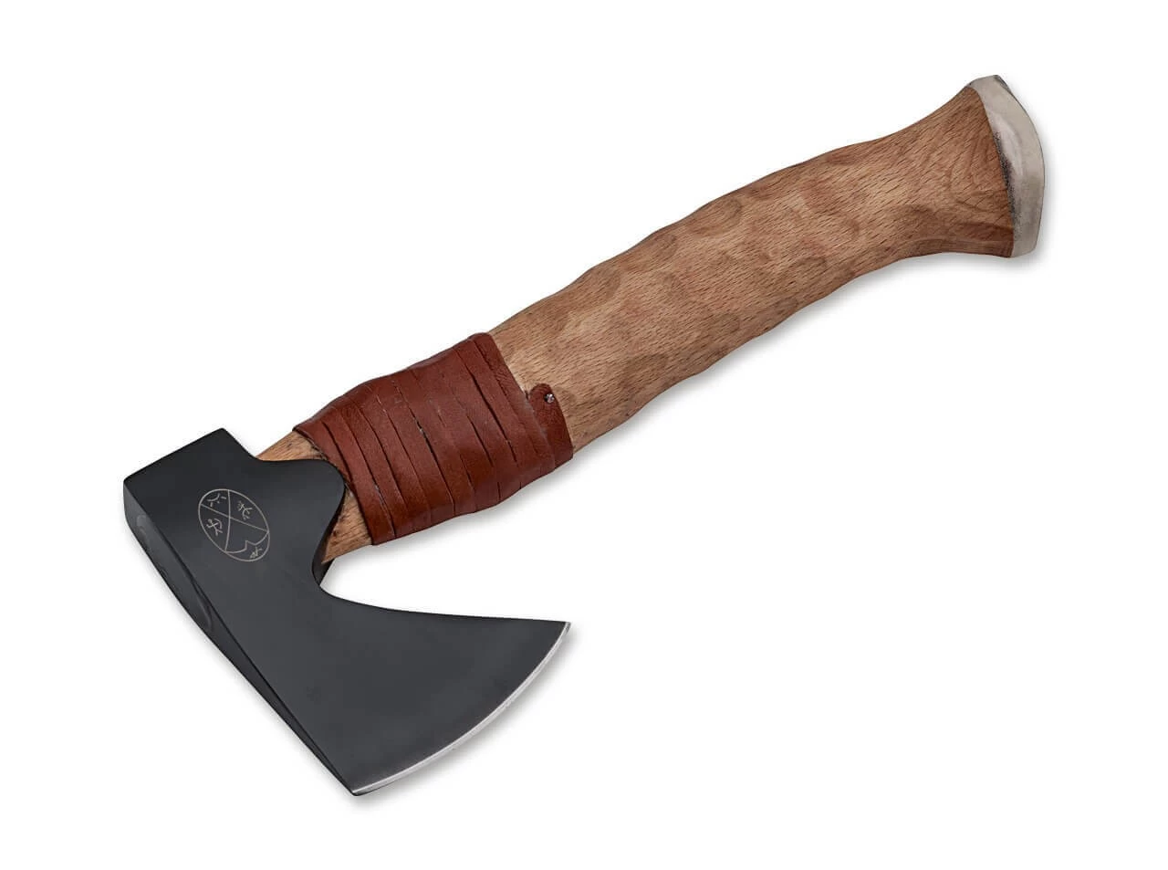 Mit der Mettämies Bushcraft Axt bietet Karesuando eine modifizierte Variante der überaus beliebten Unna Aksu an, die speziell für Bushcrafter optimiert wurde. Der Stiel wird aus Rotbuchenholz gefertigt, das eine sehr hohe Festigkeit besitzt und zudem Schockbelastungen beim Hacken noch besser verträgt. Der Stiel wird von Hand behauen und liegt extrem griffig in der Hand. Zusätzlich wird er durch gebundenes Rentierleder geschützt. Der aus hochwertigem 5Cr15MoV gefertigte und auf 56 HRC gehärtete schwarz lackierte Axtkopf weist einen modifizierten Anschliff auf, der ebenfalls vorrangig auf Hacken ausgelegt ist. Die braune Lederscheide schützt den rostfreien Axtkopf beim Transport. Der Griffabschluss aus Elchknochen rundet die robuste Bushcraft Axt gekonnt ab.