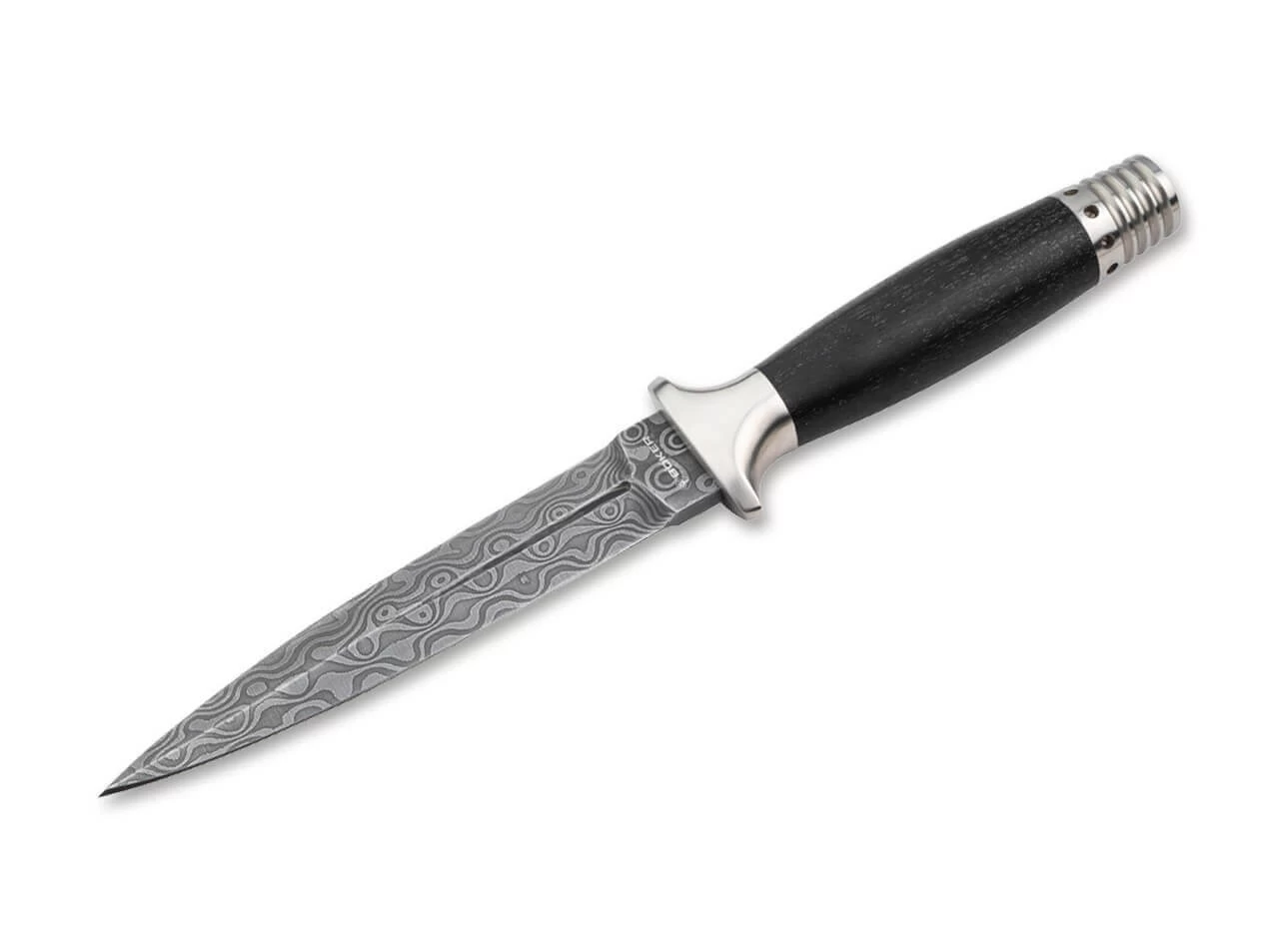 Den Stahl des MG-42 schmiedet unser langjähriger und erfahrener Partner Chad Nicols zum Herzstück des Dolches, der zweischneidig geschliffenen Klinge mit beidseitiger dezenter Hohlkehle. Das gewählte Damast-Muster Low Layer Raindrop (40 Lagen) kommt durch das symmetrische Profil der Klinge hervorragend zur Geltung.