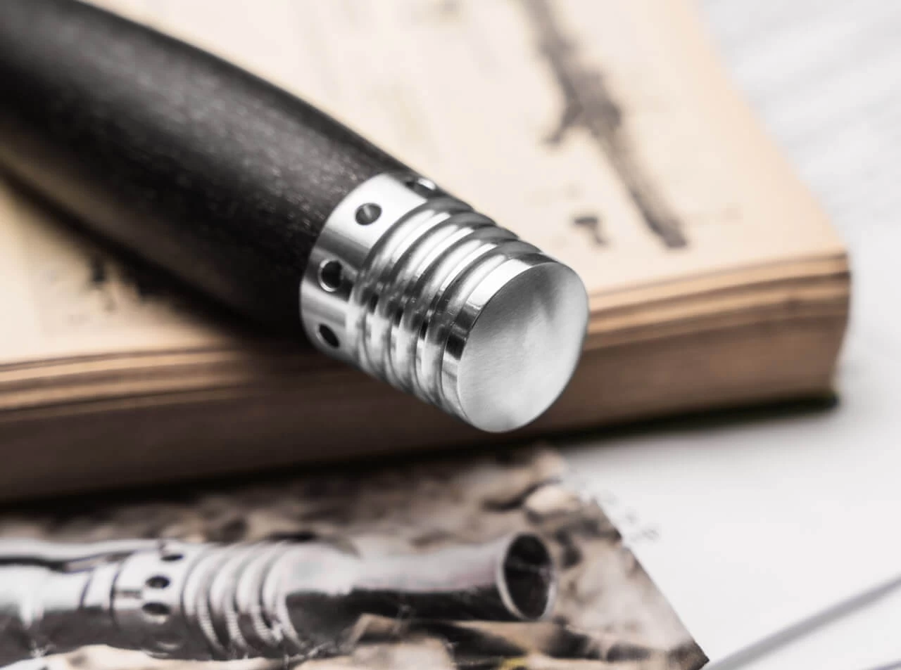 Knebel und Knauf des Dolches sind aus massivem Edelstahl gefertigt. Im Knauf wurden als Design-Element die Kühlrippen und Gasauslässe des Rückstoßverstärkers (eigentlich ein kombiniertes Bauteil mit den Funktionen Rückstoßverstärker, Mündungsfeuerdämpfer und Laufführungshülse) aufgenommen. Dennoch folgte auch hier die Form der Funktion, denn die Rillen erhöhen die Griffigkeit des Dolches im Reversgriff. Knebel und Knauf halten fugenlos die fassförmige Rolle aus Hainbuchenholz, die sich durch Ihre Form automatisch in der Hand zentriert. Der Dolch ist ausgestattet mit einer hochwertigen Scheide aus dunkelbraunem Leder mit Gürtelschlaufe und Ortverstärkung. Auslieferung mit edlem Rahmenetui zur scheinbar schwebenden Präsentation, Echtheitszertifikat und individueller Seriennummer.