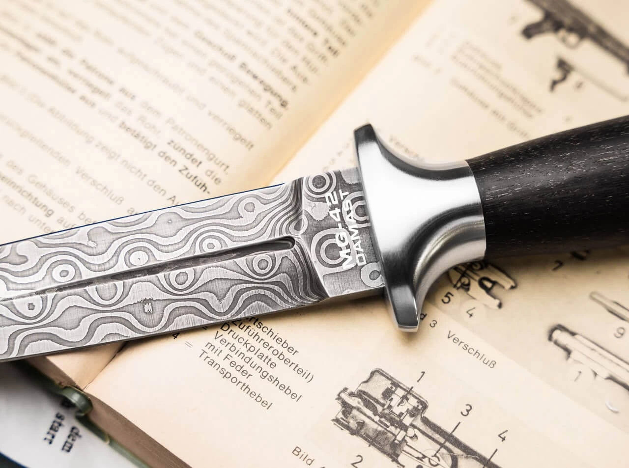 Mit dem klassisch-eleganten Böker MG-42 Damast Dolch bekommt die Krone der historischen Böker-Damast–Stahl-Projekte ein weiteres Juwel. Vor allem durch die damals revolutionäre Fertigungstechnik mit konsequentem Einsatz von Blechprägeteilen, außergewöhnliche Zuverlässig- und Bedienerfreundlichkeit und eine bis dahin unbekannte Kadenz zählt das MG-42 zu den international beachteten Meilensteinen der Waffentechnik.