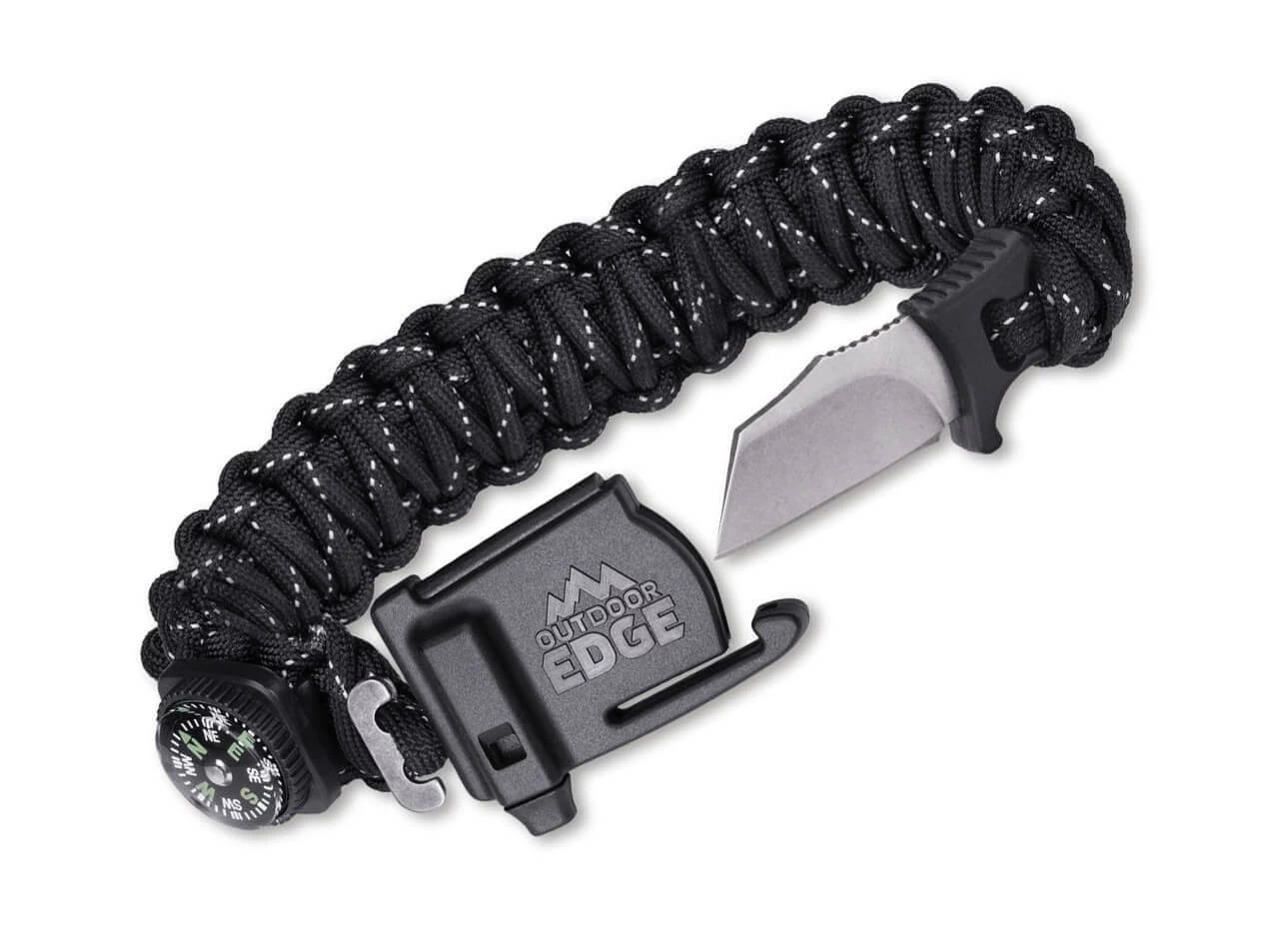 Dieses ParaSpark All-in-One-Überlebensarmband von Outdoor Edge verfügt über eine rasiermesserscharfe Sheepfoot-Klinge, einem Kompass, einer 110 Dezibel Signalpfeife und einem Ferrostab. Das Armband ist aus speziellem, reflektierendem schwarzem Nylonparacord hergestellt und ist mit einem siebensträngigen Nylonkern, einer wachsbeschichtetem Feuerleine und einer 10 Pfund monofiler Angelschnur ausgestattet. Dieses lebensrettende Armband ist unverzichtbar für jeden Outdoor-Mann, der sich in den Busch wagt. Es misst einen Umfang von 16,0-18,0 cm und ist in zwei Größen erhältlich.