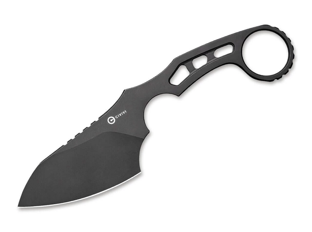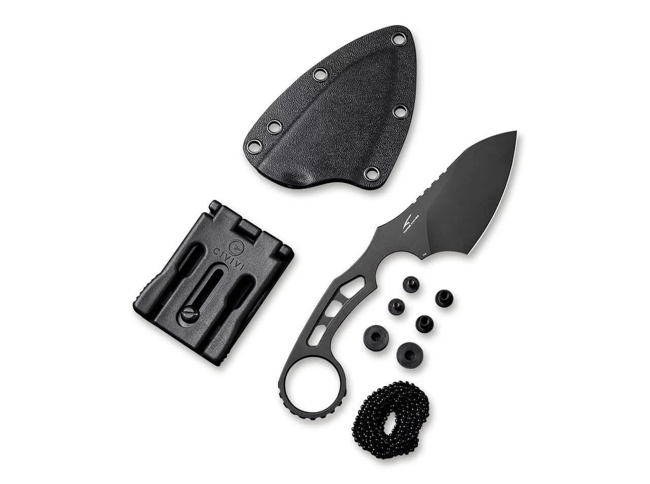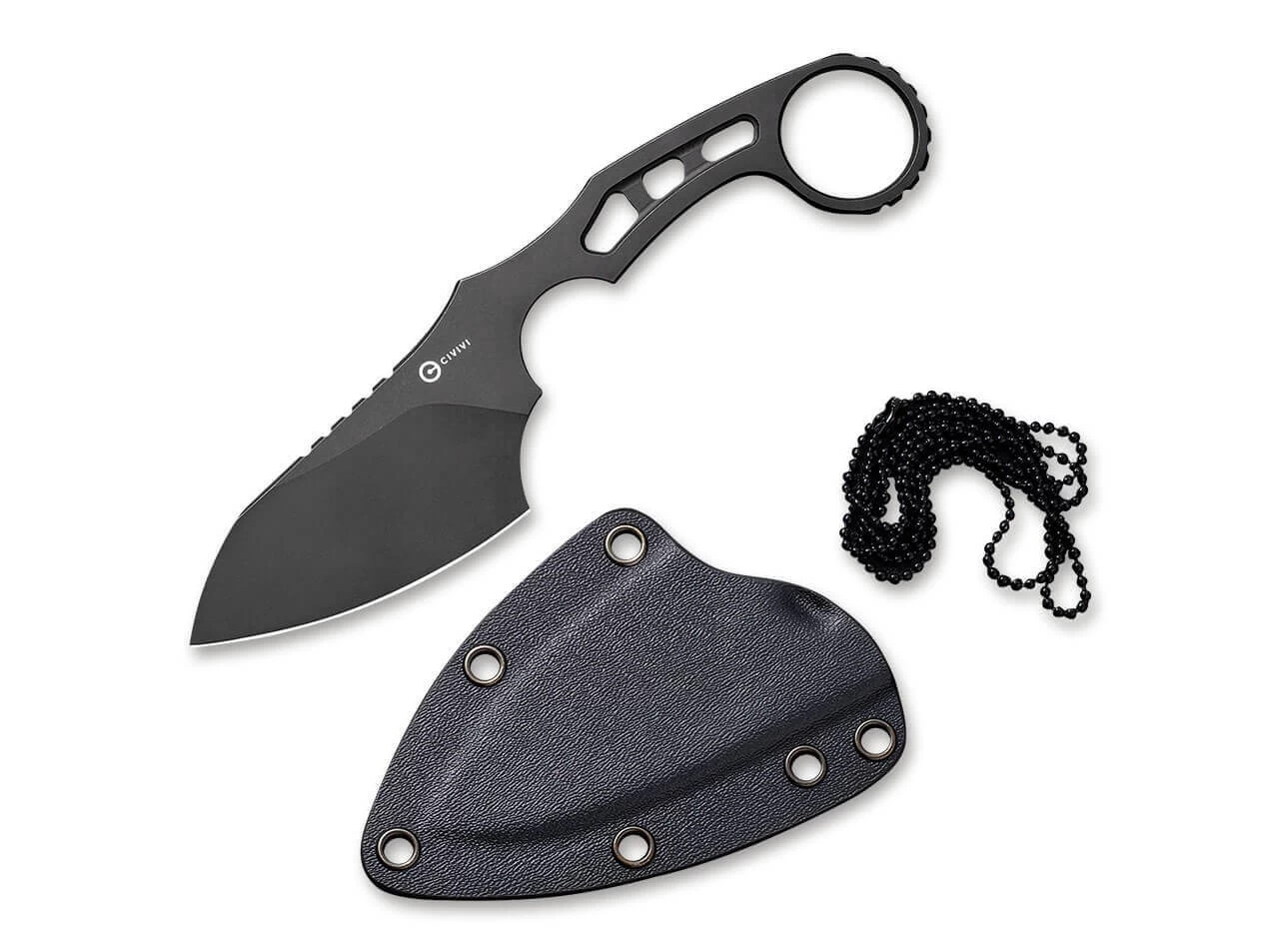 Das komplett aus D2 gefertigte CIVIVI Planck Black ist ein Neck Knife mit hohem Alltagsnutzen. Der Ring am Griffende erleichtert das Herausziehen des Messers aus der mitgelieferten Kydexscheide. Durch die Skelett-Bauweise spart das Messer an Gewicht ohne an Stabilität einzubüßen. Der schwarze Farbton macht das Messer nicht nur elegant, sondern untermalt zudem die taktische Anmutung.
