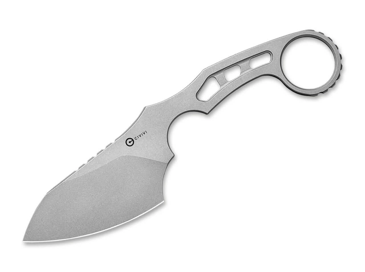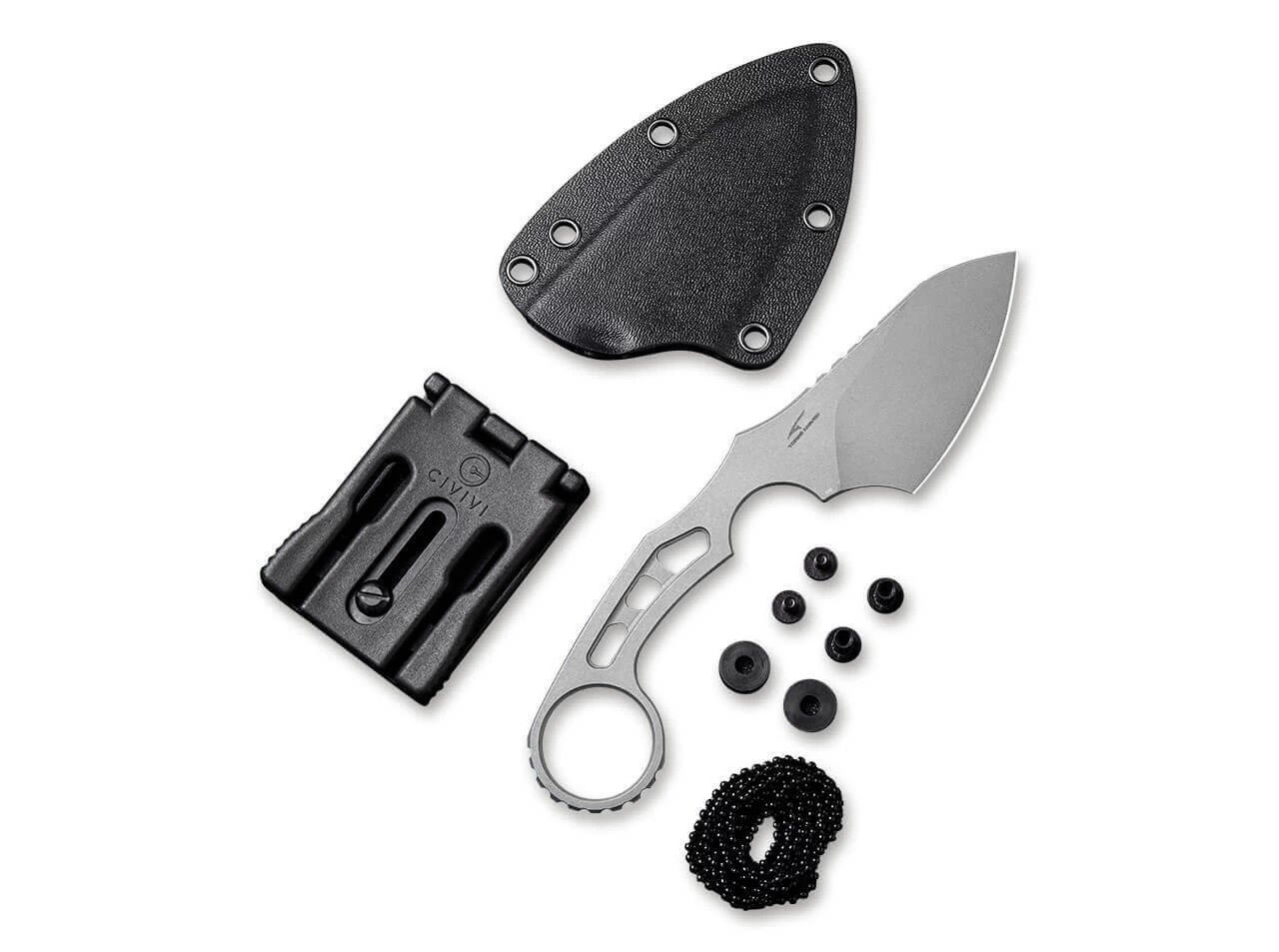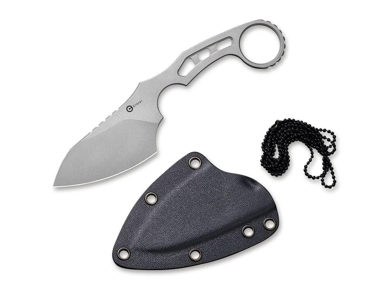 Das komplett aus D2 gefertigte CIVIVI Planck Grey ist ein Neck Knife mit hohem Alltagsnutzen. Der Ring am Griffende erleichtert das Herausziehen des Messers aus der mitgelieferten Kydexscheide. Durch die Skelett-Bauweise spart das Messer an Gewicht ohne an Stabilität einzubüßen. Der graue Farbton verleiht dem Messer eine edle Anmutung.