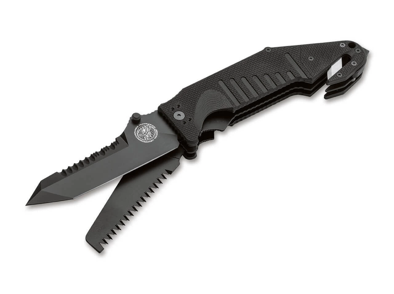 Das massive Einsatz und Rettungsmesser verfügt nicht nur über einen Glasbrecher und einen Gurtschneider mit auswechselbaren Klingen, sondern auch über eine Tantoklinge mit einem effektiven Wellenschliff am Rücken sowie eine zusätzliche ausklappbaren Säge. Rutschfeste schwarze G10-Griffschalen mit umsetzbarem Clip (Tip-down / l-r) und eine zusätzliche LAWKS-Sicherung des Linerlocks vervollständigen die Ausstattung. Mit praktischer Gürtelscheide (MOLLE-kompatibel).