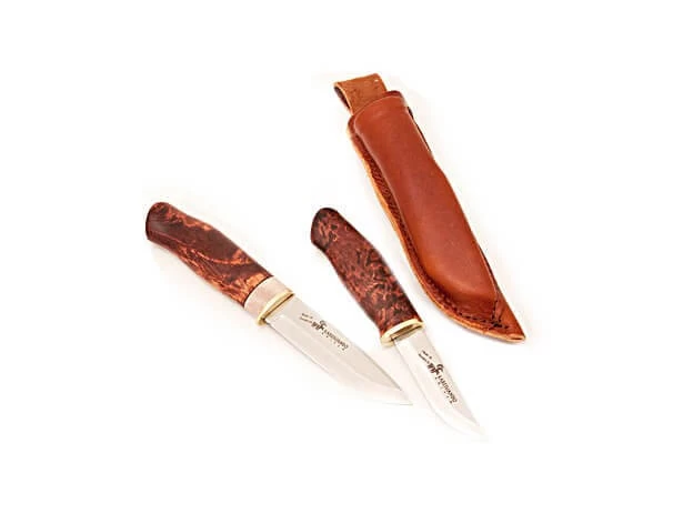 Klinge aus rostfreiem Stahl. Gehärtet auf HRC57. Messergriff aus geölter Maserbirke und Rentierhorn. Scheide aus starkem Rindsleder / Rentier.