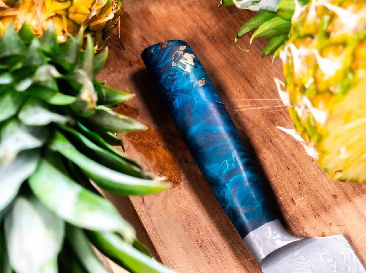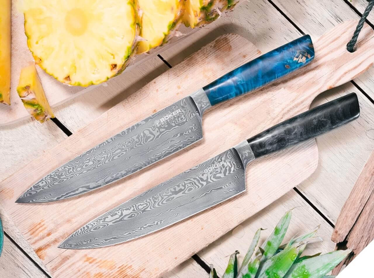 Der Griff des Böker Riviera Damast Chefmessers steht der Klinge optisch und funktional in Nichts nach. Der atemberaubende Tiefeneffekt erinnert an paradiesische Küstenabschnitte und wird durch die Stabilisation von heimischem Kastanienholz mit blauem Harz hervorgerufen. Die Auslieferung des weltweit auf nur 20 Stück limitierten Kochmessers erfolgt mit individueller Seriennummer in einer lederbezogenen Geschenkverpackung und mit Echtheitszertifikat. Handgefertigt in der Böker Messer-Manufaktur Solingen.