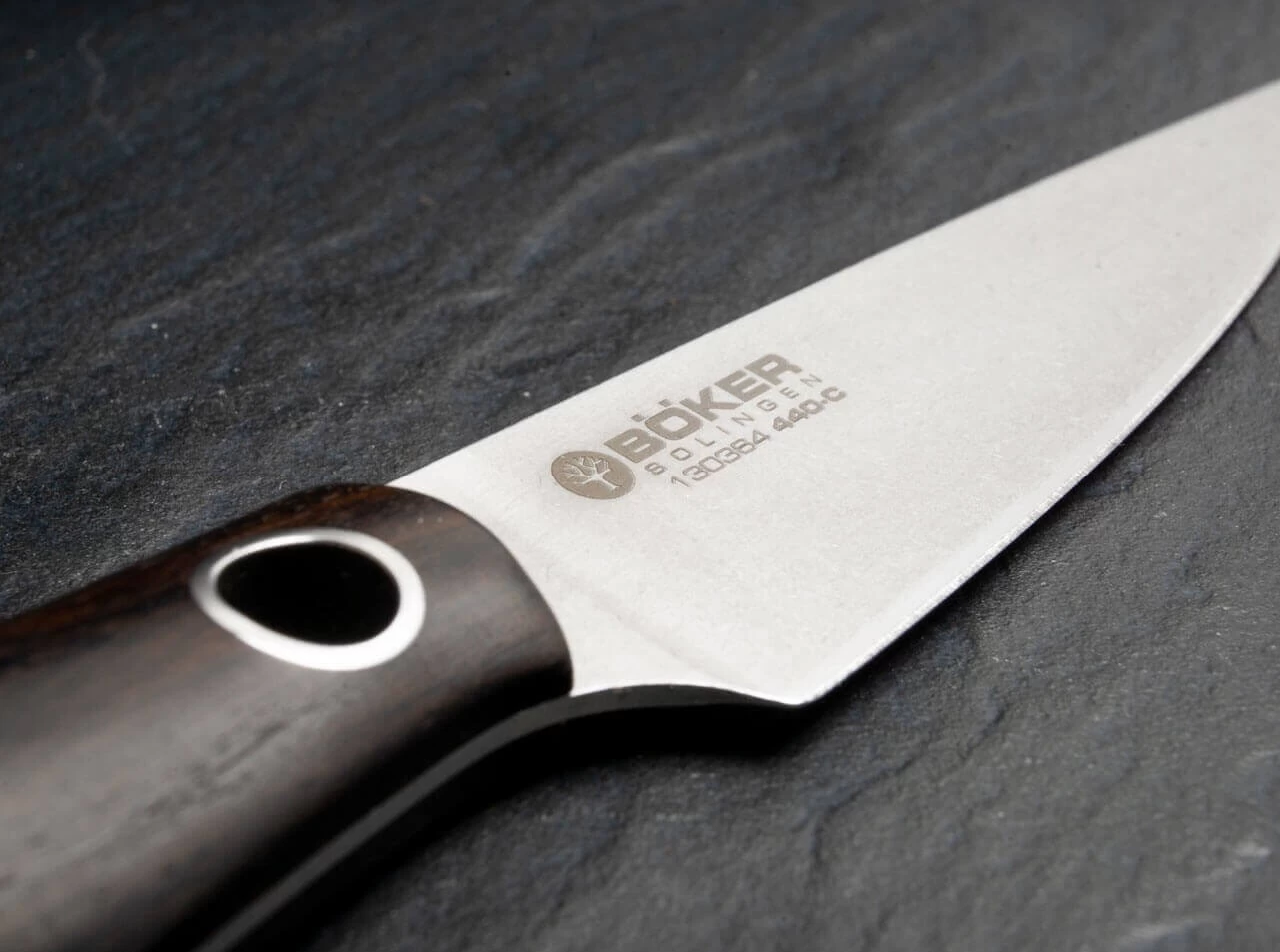 Die sanft geschwungenen Griffe werden aus exklusiv zertifiziert importiertem Grenadillholz gefertigt. Mit seiner hohen Härte und Dichte ist Grenadill u.a. fest etabliert im europäischen Holzblasinstrumentenbau. Schon bei der ersten Kontaktaufnahme mit der Messerserie Böker Saga wird die gelungene Ergonomie deutlich: Jeder Bogen, jeder Schwung in der Linie schmiegt sich an seine Stelle in der Hand und vermittelt eine absolute Kontrolle und ein überragendes Schneiderlebnis. Das schwalbenschwanzartig verbreiterte Griffende der größeren Modelle bringt zusätzliche Griffsicherheit. Die hohe Stabilität verdankt Böker Saga dem komplett durchgehenden Erl, der das Messer (in der gleichen Bauweise wie viele Jagdmesser) von der Klingenspitze bis zum Griffende durchzieht. Für eine optimale Schneidleistung steht nicht nur der komplette Flachschliff der Klinge mit Stonewash-Finish, sondern auch die Wahl von 440C als Klingenstahl, der hinsichtlich Schnitthaltigkeit und Korrosionsbeständigkeit übliche Küchenmesserstähle weit übertrifft. Dieses in einem speziellen Schleifverfahren erzeugte Oberflächenfinish zeichnet sich durch hervorragende Gleiteigenschaften im Schnittgut aus und fördert so die ohnehin ausgezeichnete Schneidleistung. Des weiteren ist die Mikrostruktur des Stonewash-Finish extrem unempfindlich gegen Kratzer, da diese sich optisch in der Struktur oft verlieren..Den besonderen Akzent setzen die großen Hohlnieten, die unverkennbar die Handschrift von Jesper Voxnæs tragen.