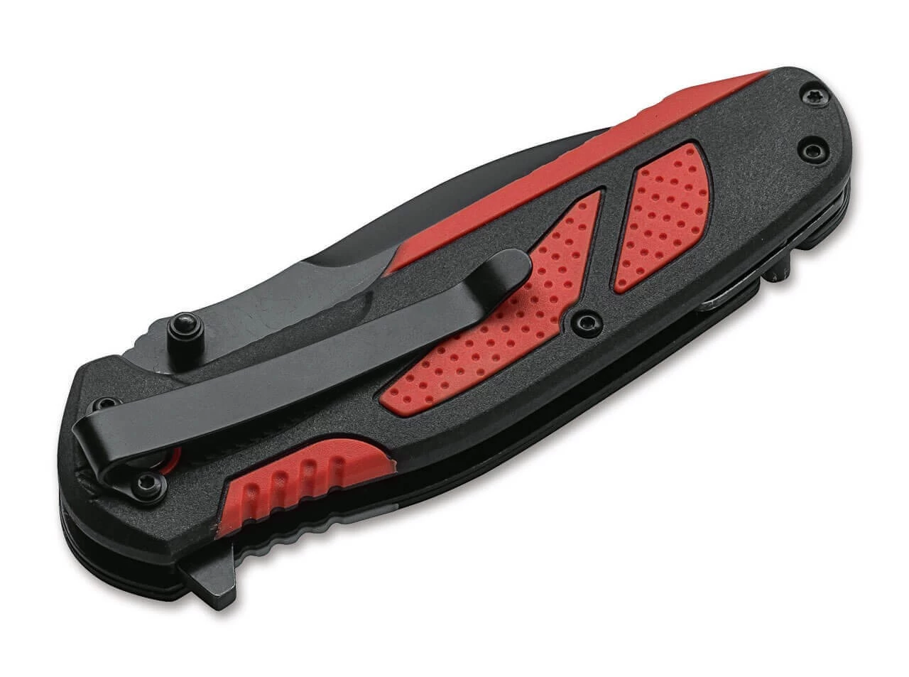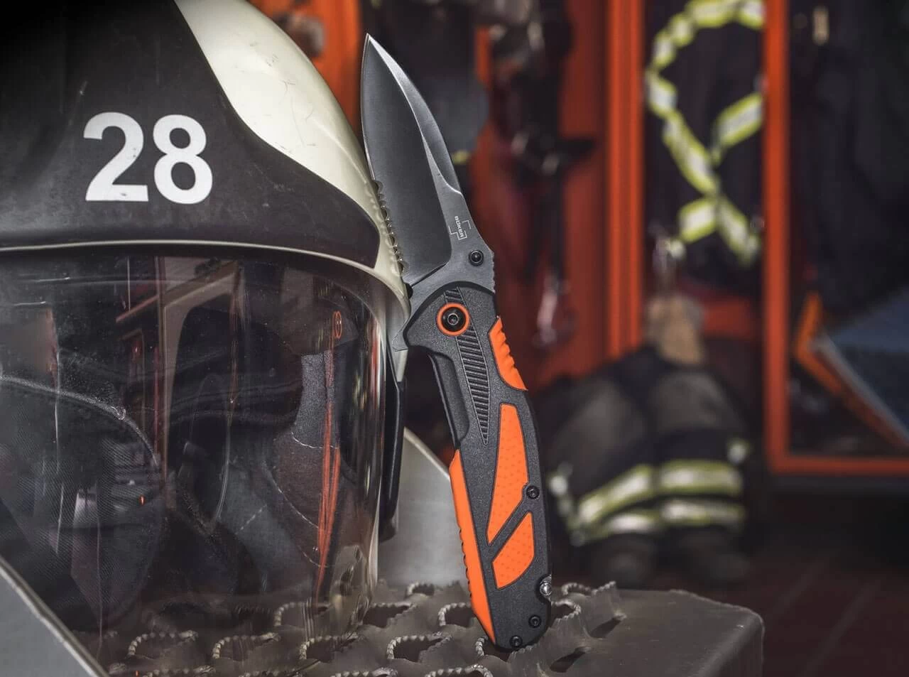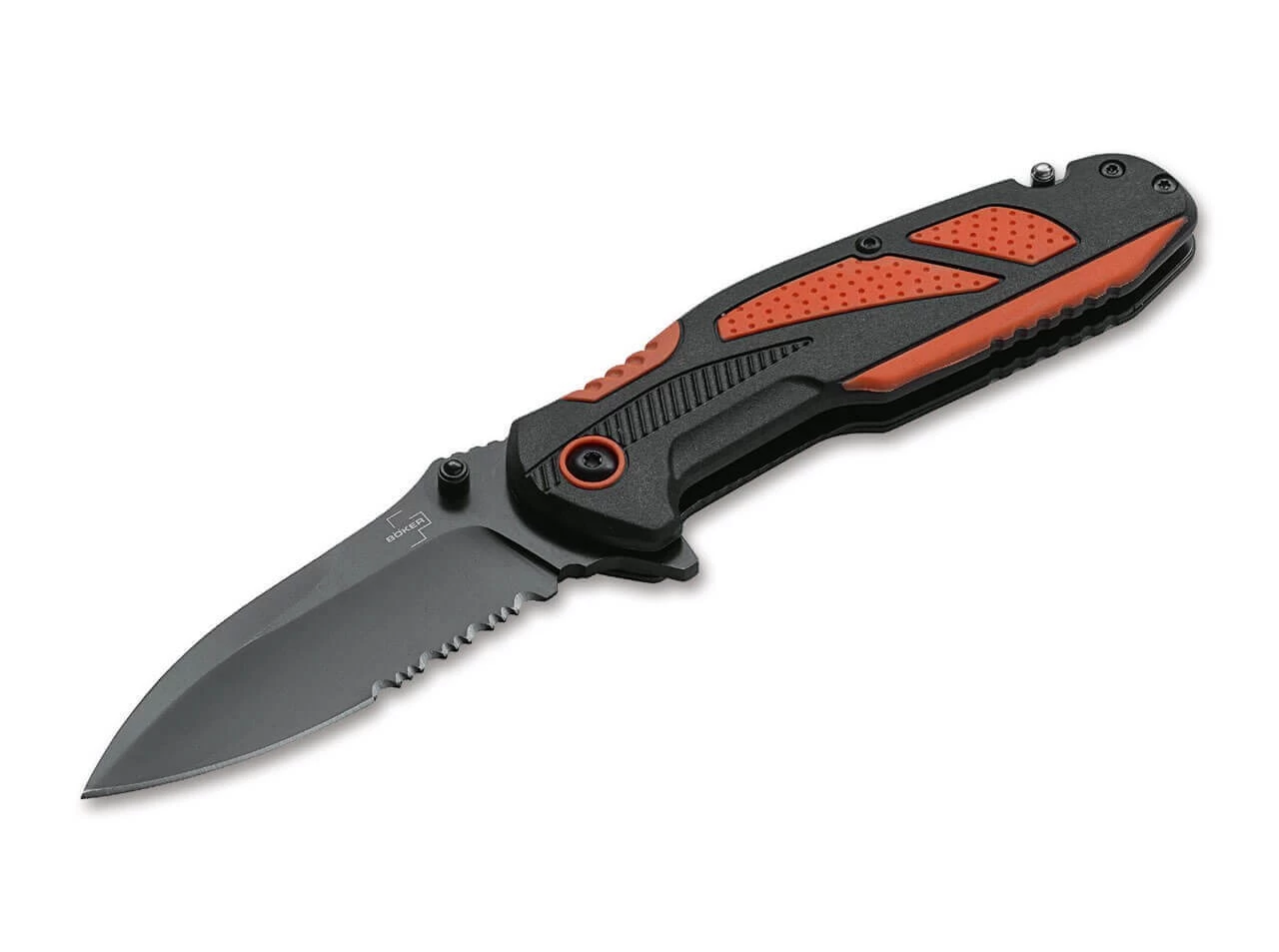 Das zuverlässige Böker Plus Savior 4 ist sowohl für den privaten Nutzer konzipiert, der sich für die Fremd- oder Eigenhilfe bei einem Unfall wappnen möchte, als auch für den professionellen Anwender, der das Messer dienstlich als Rettungswerkzeug führt. Solide Stahlplatinen tragen eine glasfaserverstärkte Kunststoffbeschalung, die an strategischen Stellen mit direkt aufgespritzten rutschfesten Gummieinlagen aus orangefarbenem TPR versehen sind. Dies gewährleistet ein sicheres Handling auch bei Nässe oder Kälte und in Stresssituationen. Der ausklappbare Gurtschneider ermöglicht das gefahrlose Kappen von Gurten auch nah am Körper. Die schwarz beschichtete Klinge des Linerlock Messers aus 12C27 öffnet per Flipper oder Daumenpin und ist mit einem praktischen Teilwellenschliff versehen. Mit hochwertigem Nylon-Gürteletui und Deep-Carry-Clip (Tip-down/r).