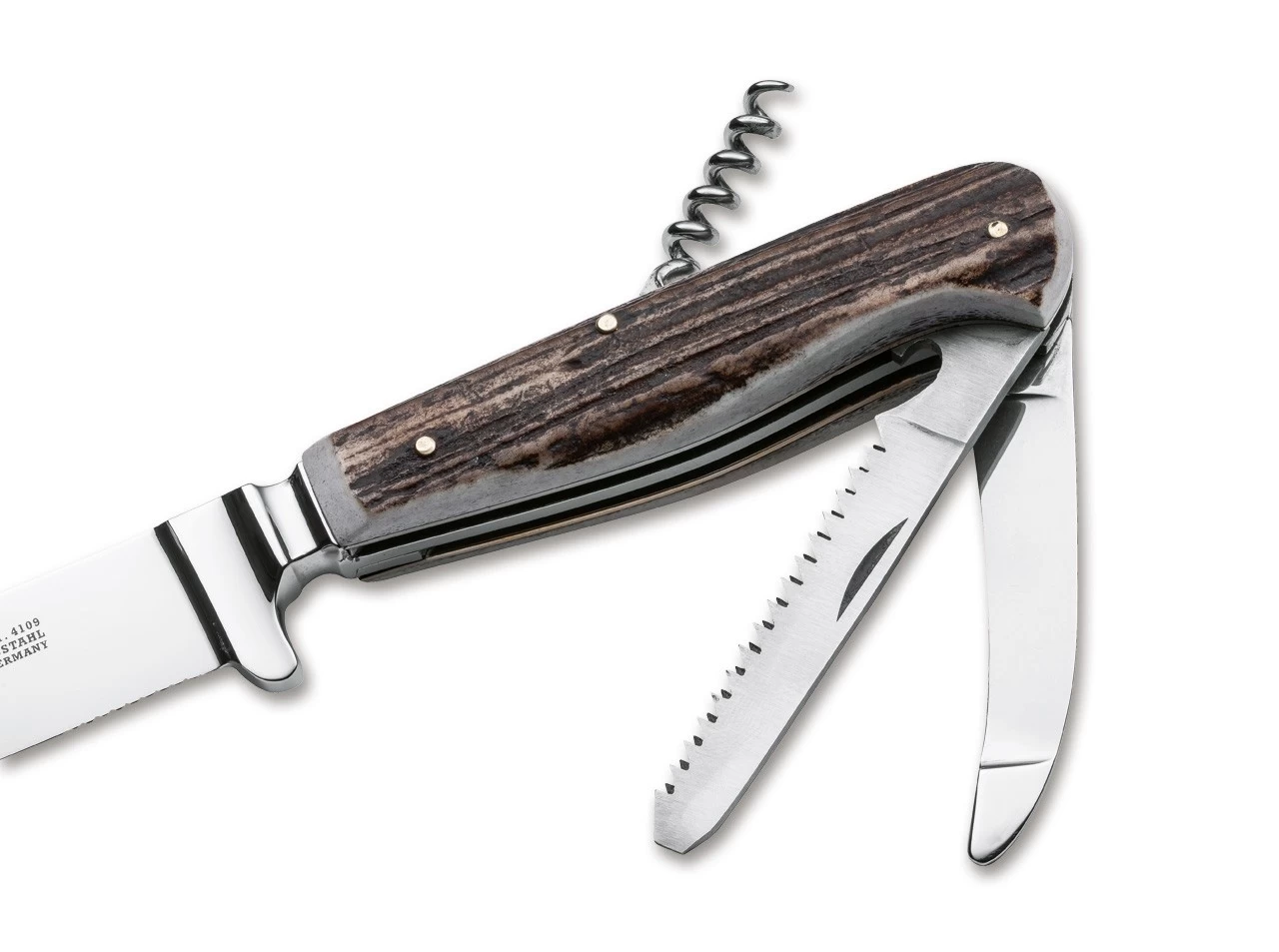 Als Schalenwildmesser bezeichnet man diese Version des Nickers mit Zusatzwerkzeugen in Vollausstattung. Zusätzlich zur feststehenden Nickerklinge sind im Griff eine Säge mit Kapselheber und Schraubendreher sowie eine Aufbruchklinge und ein Korkenzieher untergebracht. Klinge aus 4109, mit kleinem Anreiß-Wellenschliff und Hochglanzpolitur. Lieferung mit klassischer Nickerscheide mit abnehmbarer Gürtelschlaufe.