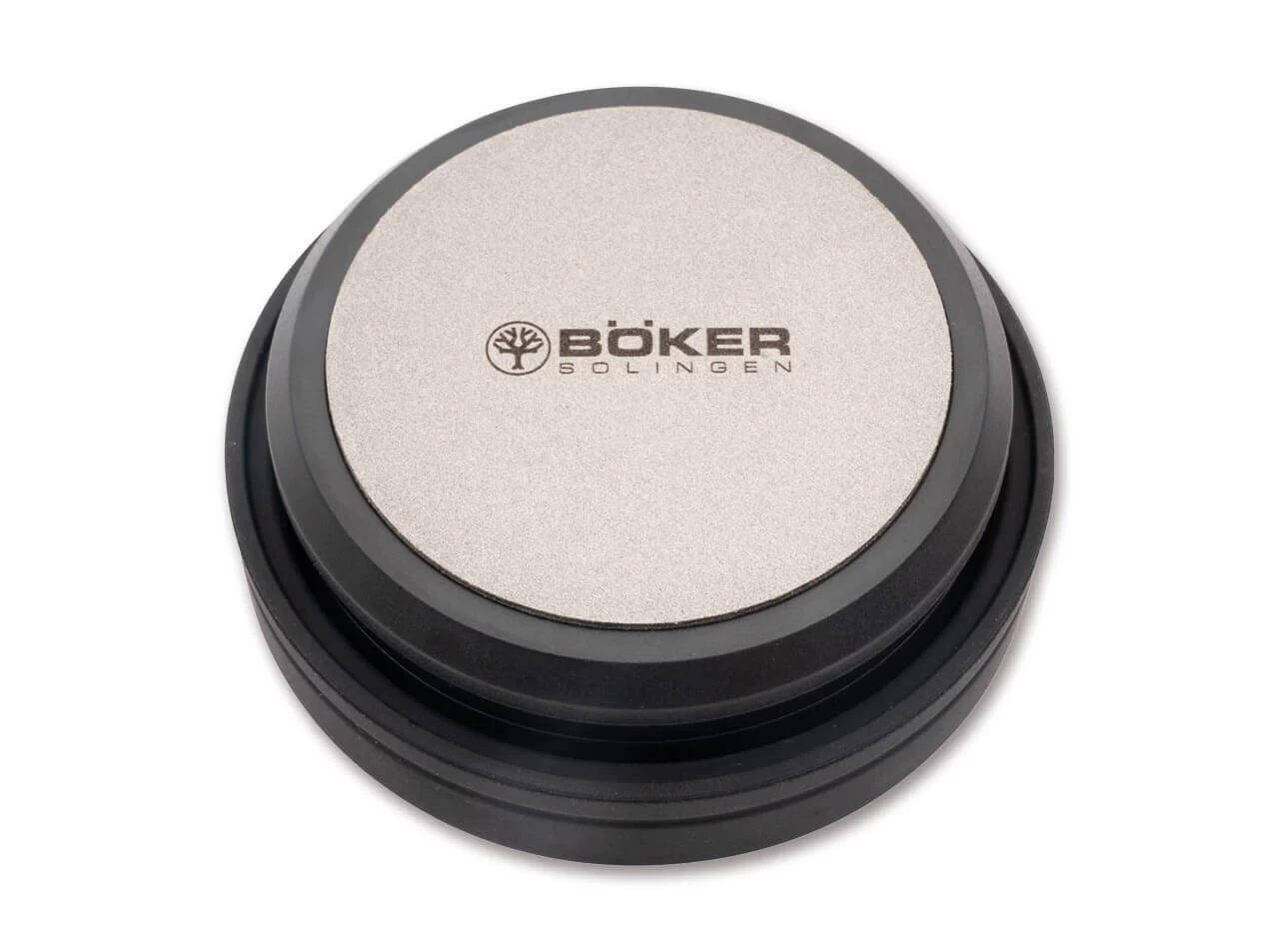 Dieser Puck trägt auf einem Kunststoffkern eine mit Industriediamant beschichtete Schleiffläche der Körnung 360 und auf der anderen eine Schleiffläche aus technischer Keramik mit maximaler Feinheit. Beide Seiten sind sowohl für den Nass- als auch für den Trockenschliff geeignet. Der Durchmesser der beiden Schleifflächen beträgt jeweils 6 cm.