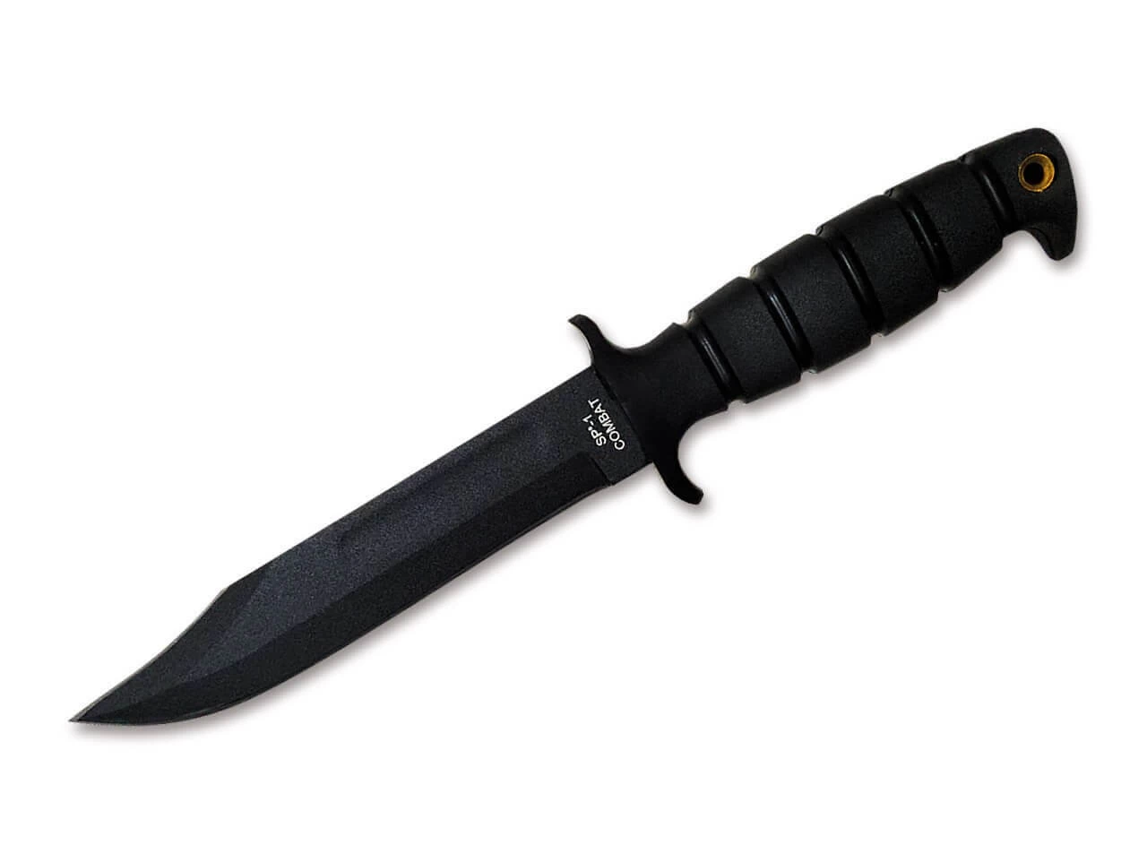 Das SP-1 Combat Knife von Ontario verfügt über eine Clip-Point-Klinge aus 1075. Der schwarze Griff wird aus rutschfestem plastischem Elastomer gefertigt. Das Messer wird in den USA hergestellt und kommt mit einer schwarze Cordura-Gürtelscheide.