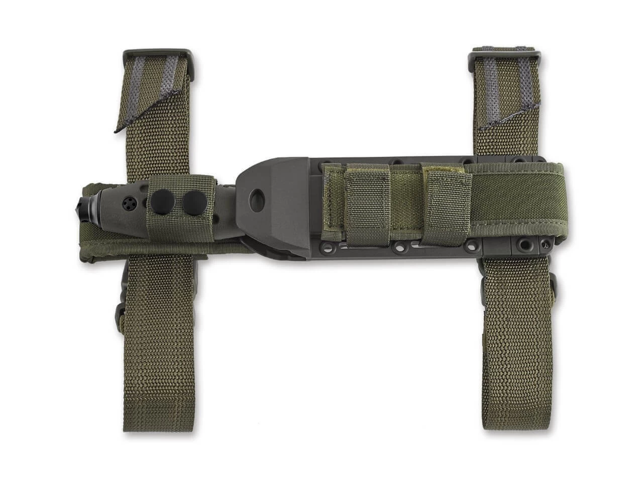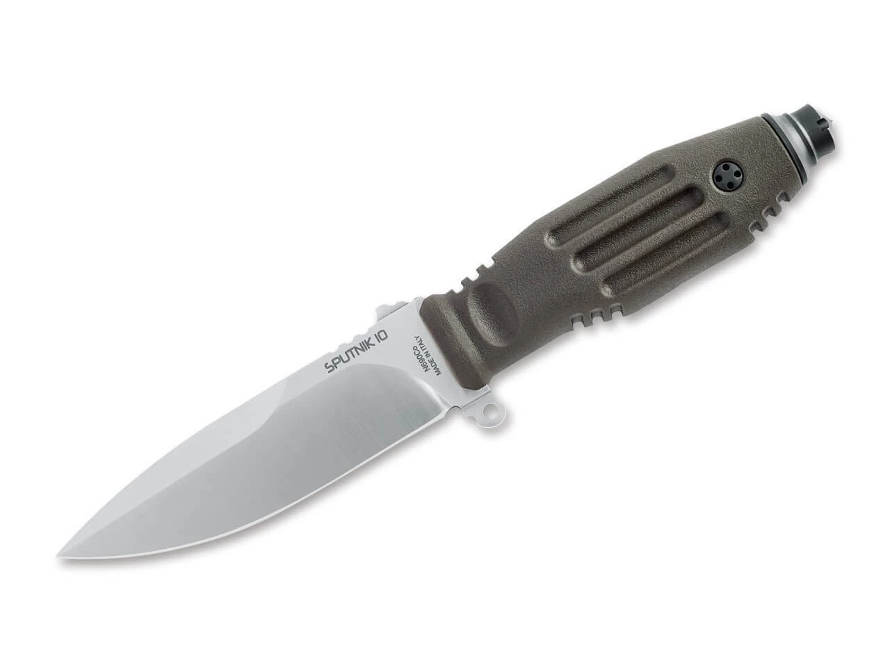 Die FKMD Sputnik Serie glänzt vor allem mit besonders hohem Gebrauchswert und einer extrem sicheren Handlage. Durch das grüne TPR Griffmaterial ist das Sputnik 10 auch bei Nässe oder Kälte sehr komfortabel und sicher zu handhaben, wozu die zahlreichen Mulden und Rillen ihren Teil beitragen. Das kleine integrierte Parierelement trägt ebenso eine Öse wie der Glasbrecher im Griffende, wodurch sich das feststehende Messer zum Beispiel auch an einem Stock festbinden lässt. Die satinierte Klinge aus N690 ist mit ihrer außergewöhnlichen Stärke von 5mm optimal dimensioniert, um Schneidpotential und Stabilität zu vereinen. Die Fehlschärfe der Drop-Point Klinge unterstreicht den taktischen Charakter des Einsatzmessers. Die äußerst funktionale symmetrische Scheide ist aus GFK gefertigt und sitzt in einem Molle-kompatiblen Nylonhalter mit Gürtelschlaufe und abnehmbaren Beingurten.