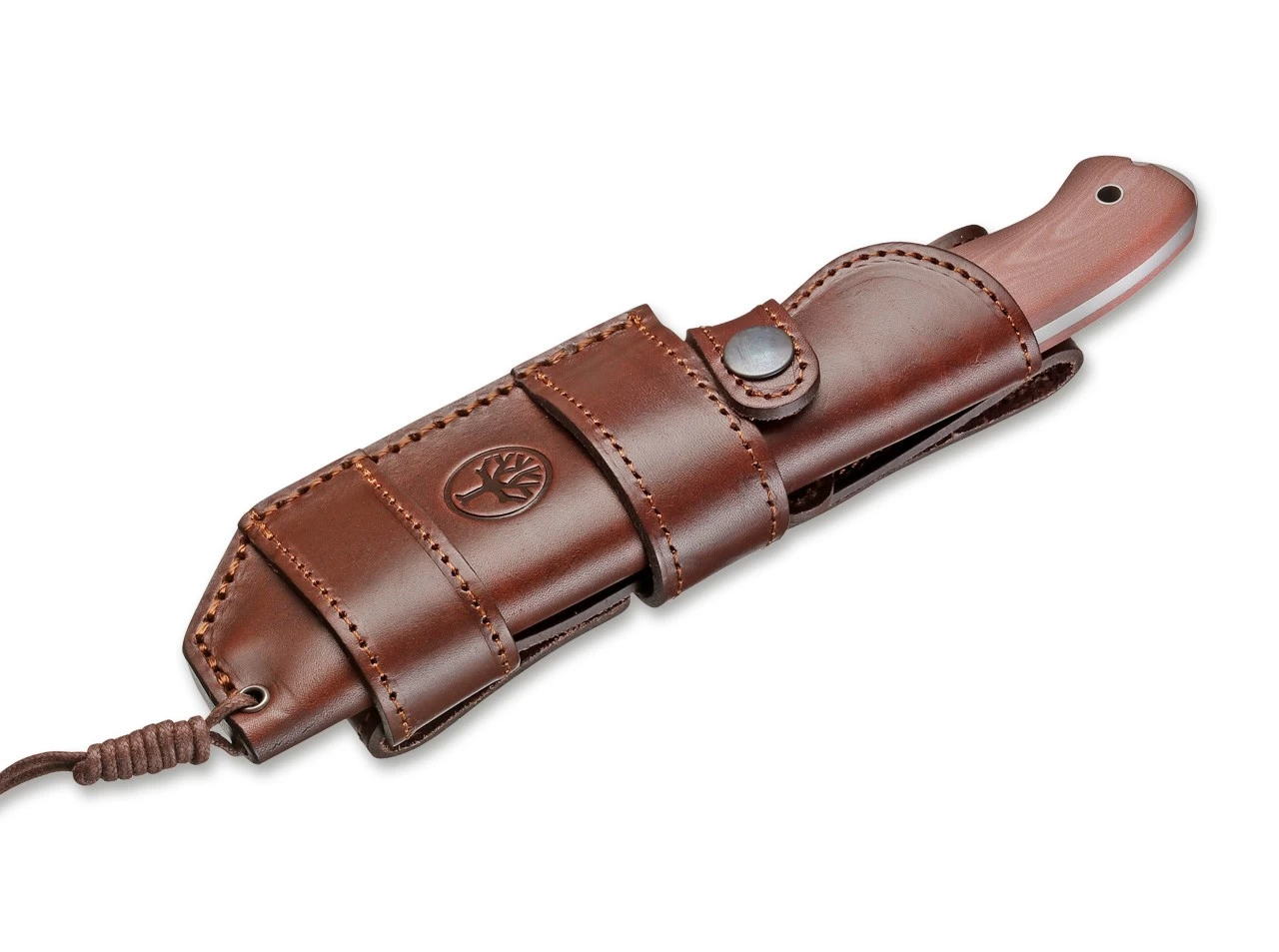 Der perfekt geformte Griff ist mit braunem Leinen-Micarta beschalt und liegt in allen Einsatzlagen satt in der Hand. Die Klinge verdankt ihre hohe Stabilität nicht allein der satten Materialstärke von 4,5 Millimeter, sondern auch dem tief gesetzten Anschliff, der ähnlich wie bei einem Bushcraftmesser für eine überdurchschnittliche Belastbarkeit sorgt. Das fein gestrahlte Finish der N690-Klinge kombiniert Gediegenheit und Sachlichkeit. Mit verdeckter Fangriemenöse im Erl. Die Auslieferung erfolgt mit einer hochwertigen Lederscheide, die wahlweise längs oder quer getragen werden kann.