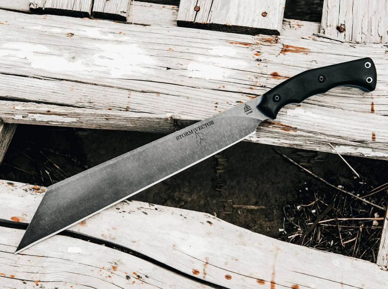 Der Storm Vector von TOPS ist die moderne Interpretation des insbesondere bei den Wikingern verwendeten Scramasax. Die Machete ist mit einer grau beschichteten Klinge aus nicht rostfreiem 1095 Kohlenstoffstahl ausgestattet und untermalt sein stürmisches Gemüt mit dem Blitzmotiv auf der Klingenvorderseite. Der Griff aus Micarta wird von blauen Linern geschmückt und liegt dank seiner ergonomischen Form auch bei widrigen Bedingungen ideal in der Hand. Mit Kydexscheide und Doppel-Fangriemenöse am Griffende.