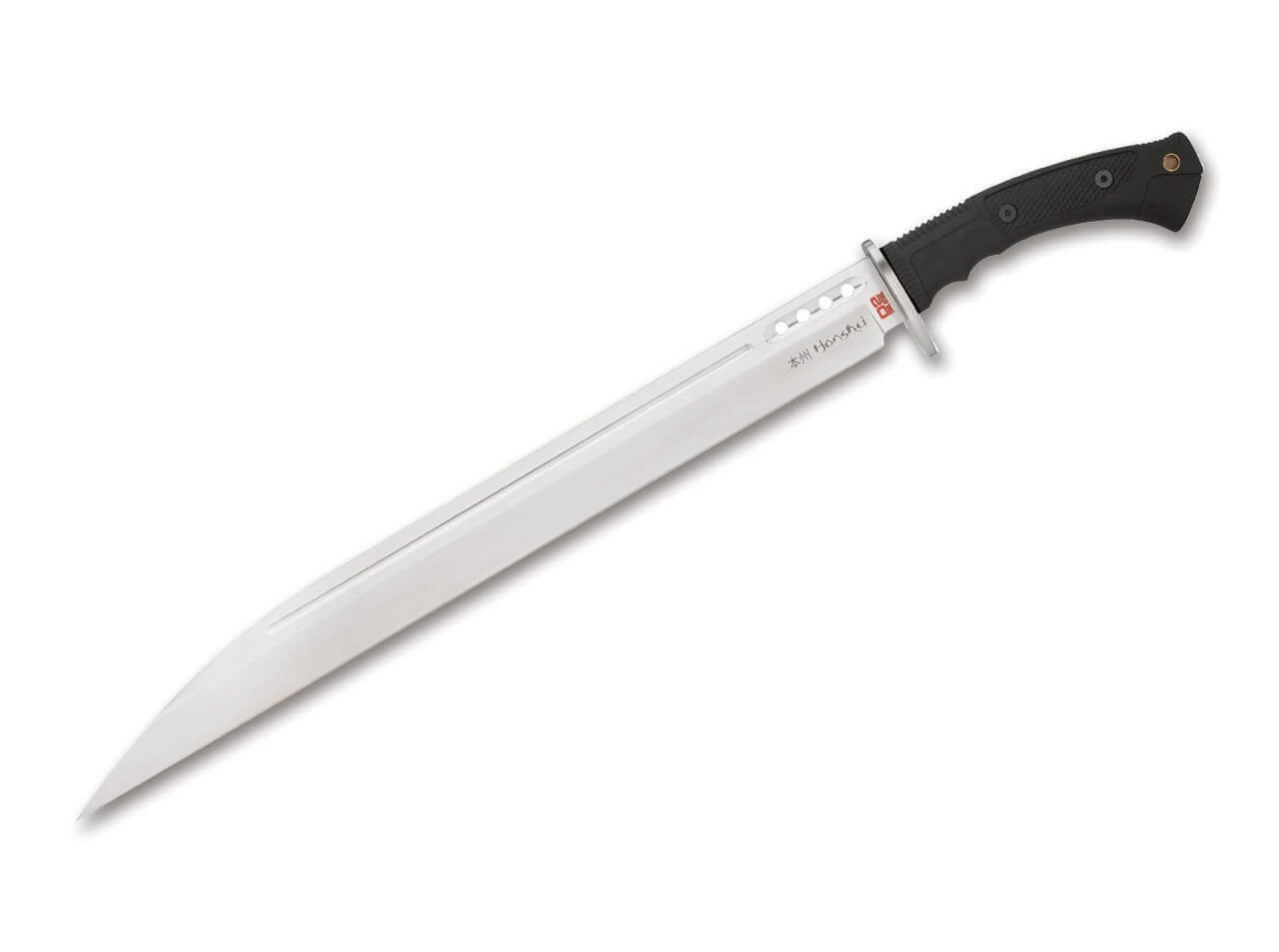 Das Honshu Boshin Seax Knife erweitert in außergewöhnlicher Weise die taktisch geprägte Boshin-Linie, die Tradition, Innovation, Stil und Funktion miteinander verbindet. Die D2 Klinge ist als Vollerl konstruiert und verfügt über gewichtsreduzierende Aussparungen im hinteren Klingenbereich. Der strukturierte, ergonomisch geformte TPR-Griff ist mit hochbelastbaren Schrauben am Erl befestigt und die Rillen sorgen für einen sicheren, rutschfesten Griff. Das Seax-Messer wird in einer hochwertigen, verstärkten Echtleder-Gürtelscheide geliefert, die mit einem Paracord-Lanyard akzentuiert wird.