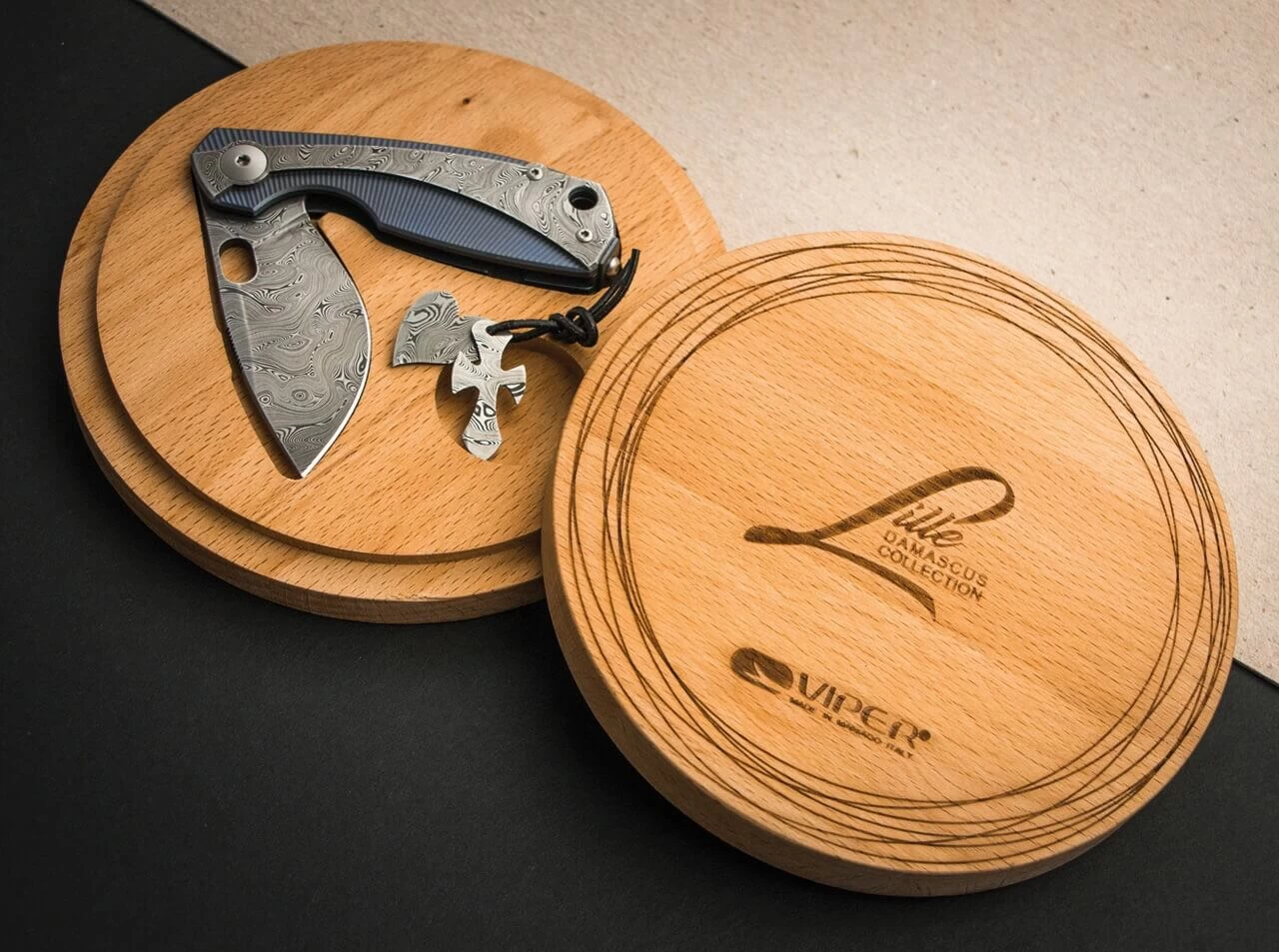 Die exklusivste Version des Lille von Jesper Voxnæs besitzt eine Klinge aus dem pulvermetallurgischen Damasteel, der sich nicht nur durch seine hervorragende Korrosionsresistenz auszeichnet, sondern auch durch seine hohe Härte und Schnitthaltigkeit, weshalb er sich auch im Alltagseinsatz bestens bewährt. Als Damastmuster kommt hier Björk Twist zum Einsatz. Der Titangriff trägt ein Overlay, das ebenso wie die Klinge des Framelock-Messers aus Damasteel Björk Twist gefertigt ist und so dem Messer eine besonders hochwertige Anmutung verleiht. Die kugelgelagerte Damastklinge öffnet per Flipper oder per Daumenloch. Ein überaus eleganter und eigenwilliger Folder, der dem Begriff des Gentleman-Messers eine neue Dimension verleiht. Geliefert wird das Lille Damasteel Blue in einer runden Holzschatulle. Dem Messer liegen noch kleine Anhänger aus dem gleichen Damasteel bei, mit denen der Besitzer seine Liebe zu diesem exquisiten Material zum Beispiel an einer Halskette nach außen tragen kann.