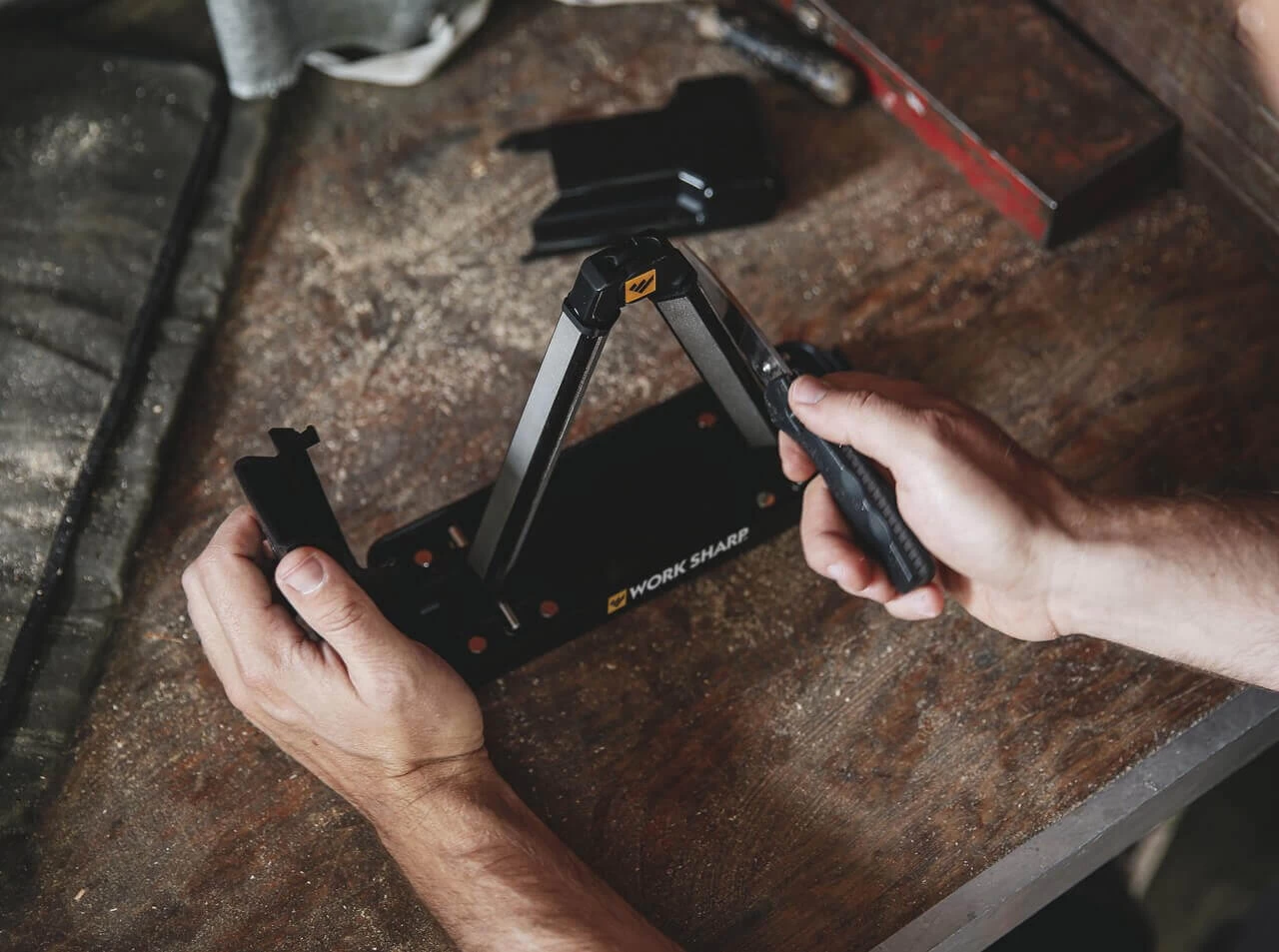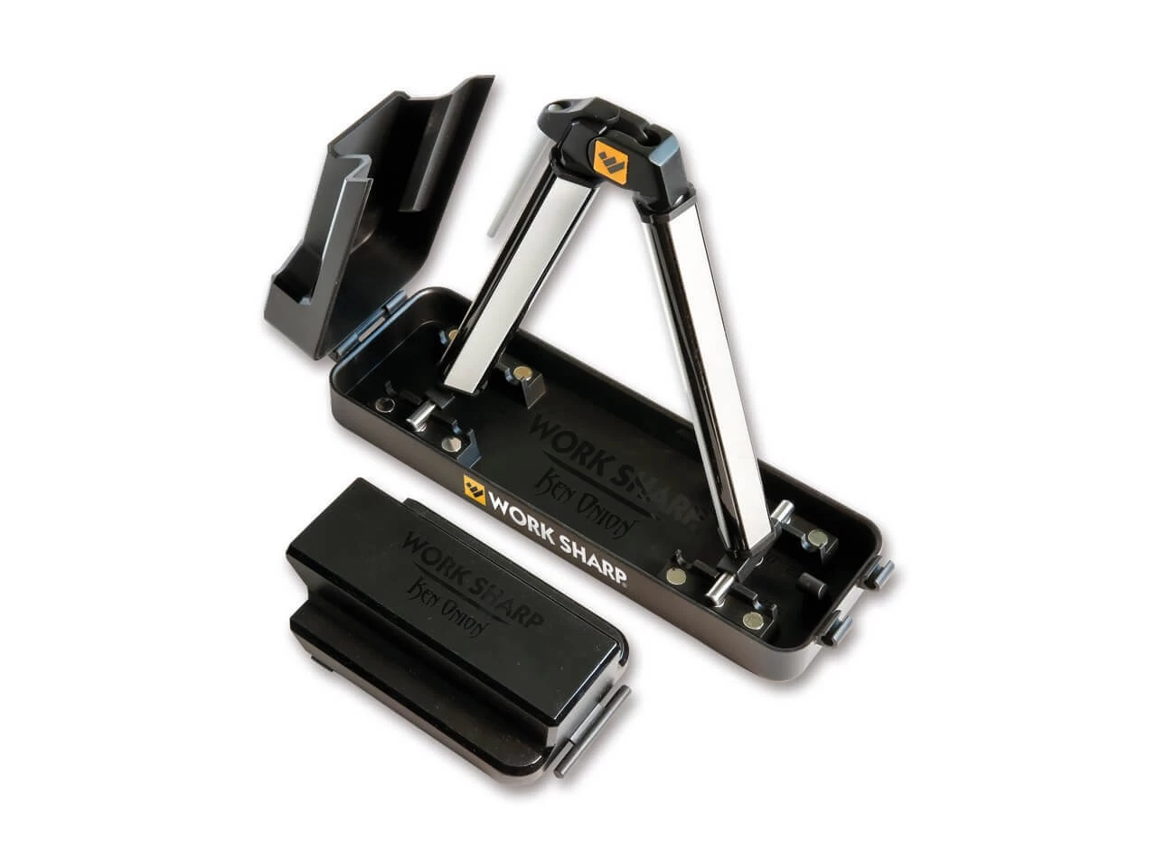 Der von Ken Onion entworfene Work Sharp Angle Set Knife Sharpener ist ein einstellbarer Messerschärfer, der mit drei unterschiedlichen Körnungen und fünf verschiedenen Schleifwinkeln überaus vielseitig ist. Die drehbaren Stäbe sind mit einer groben Diamantschleiffläche in der Körnung 400, einer feinen Diamantschleiffläche in der Körnung 800 und einer besonders feinen Keramikschleiffläche für den Feinabzug ausgestattet. Der Schleifwinkel kann auf 15°, 17,5°, 20°, 22,5° oder 25° eingestellt werden. Mit dem zusätzlichen konischen Keramikschärfer lassen sich auch Klingen mit Wellenschliff schnell wieder aufarbeiten. Der Angle Set Knife Sharpener lässt sich bequem zusammenklappen und verstauen.